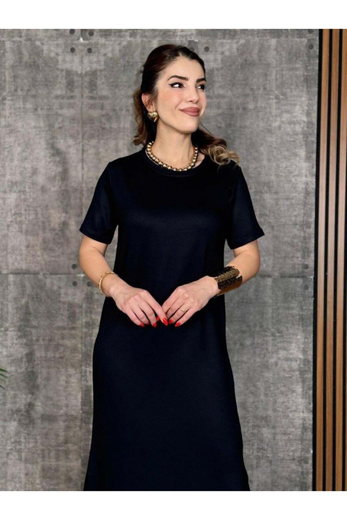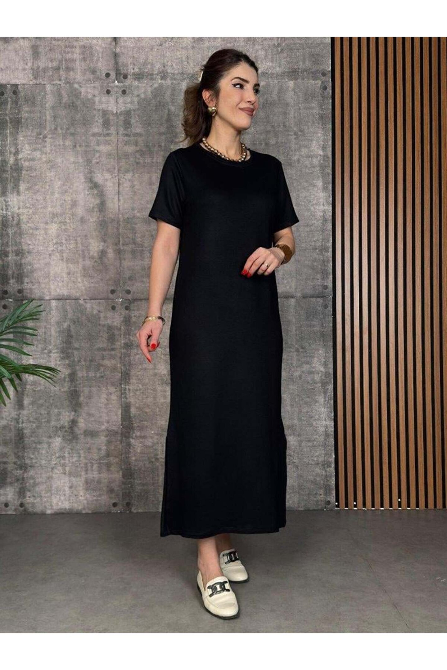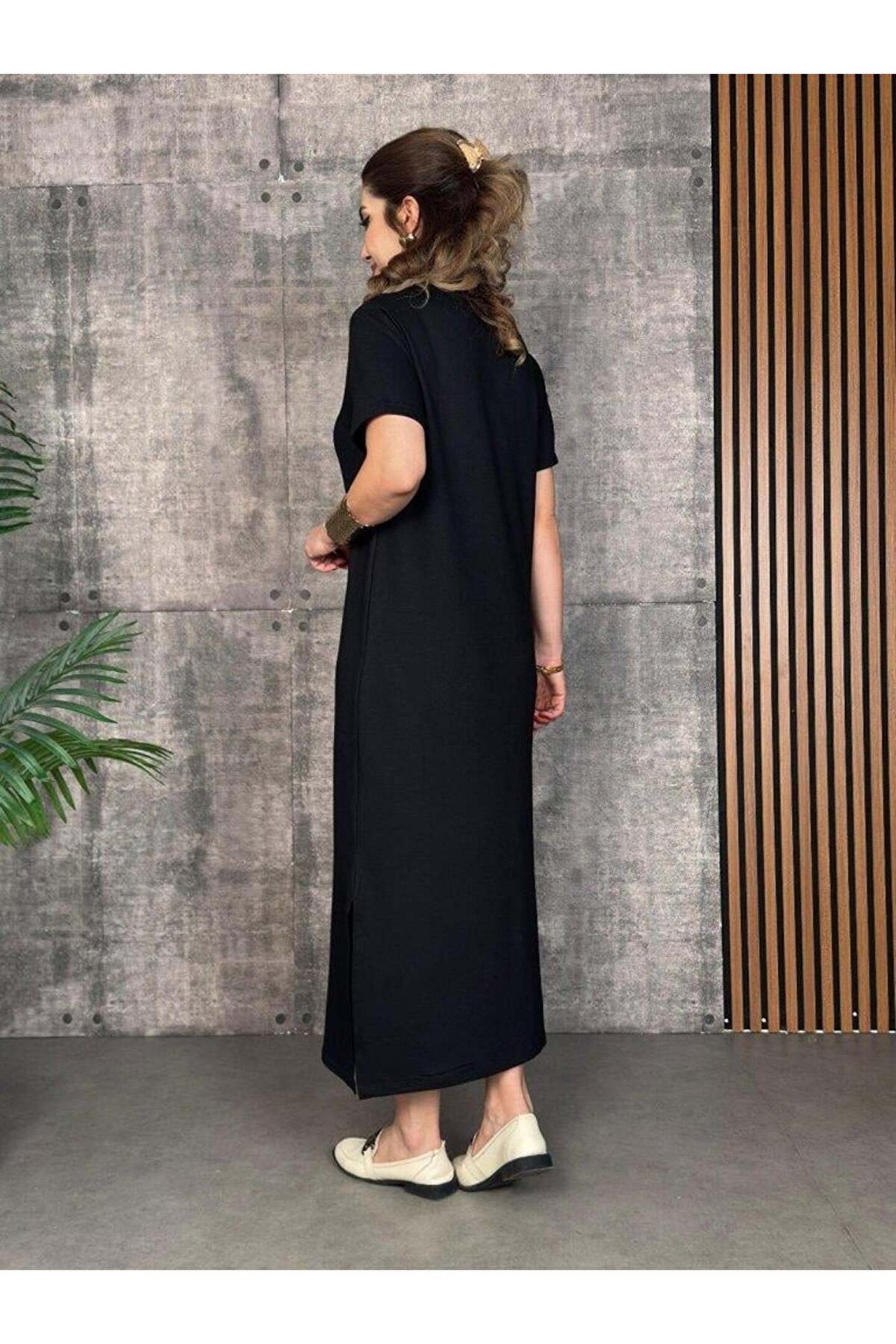 SGM BUTİK Kadın Kısa Kollu Bisiklet Yaka Yırtmaçlı Viskon Iki Iplik Elbise