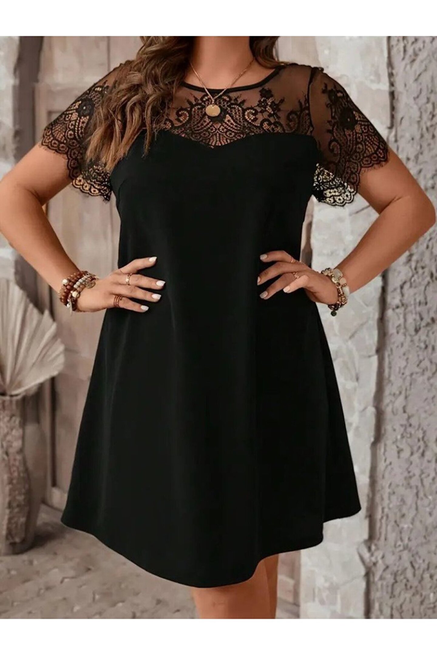 SGM BUTİK Kadın Kısa Kollu Dantel Bisiklet Yaka Ve Kol Dantel Detaylı Janjan Krep Elbise