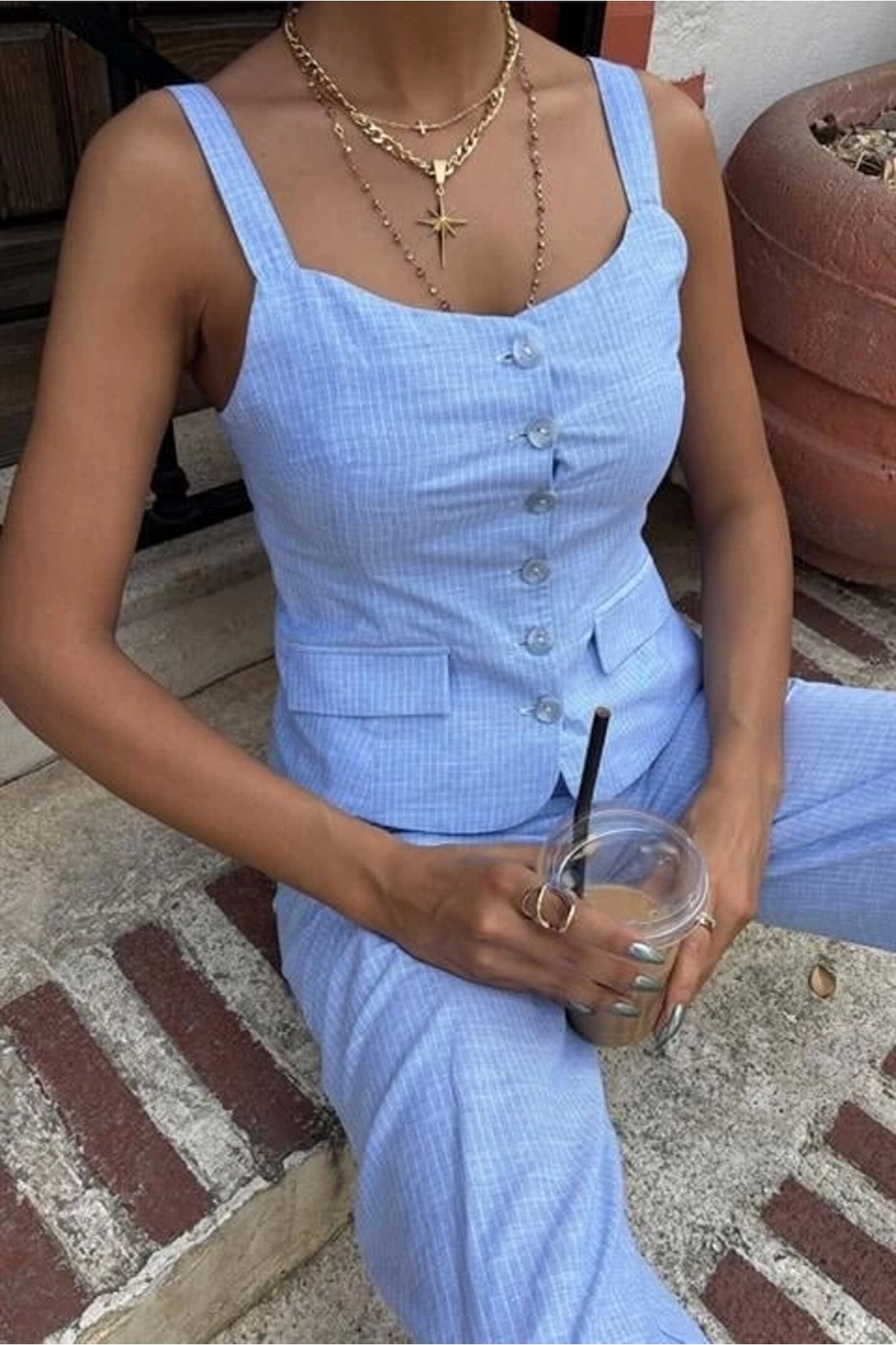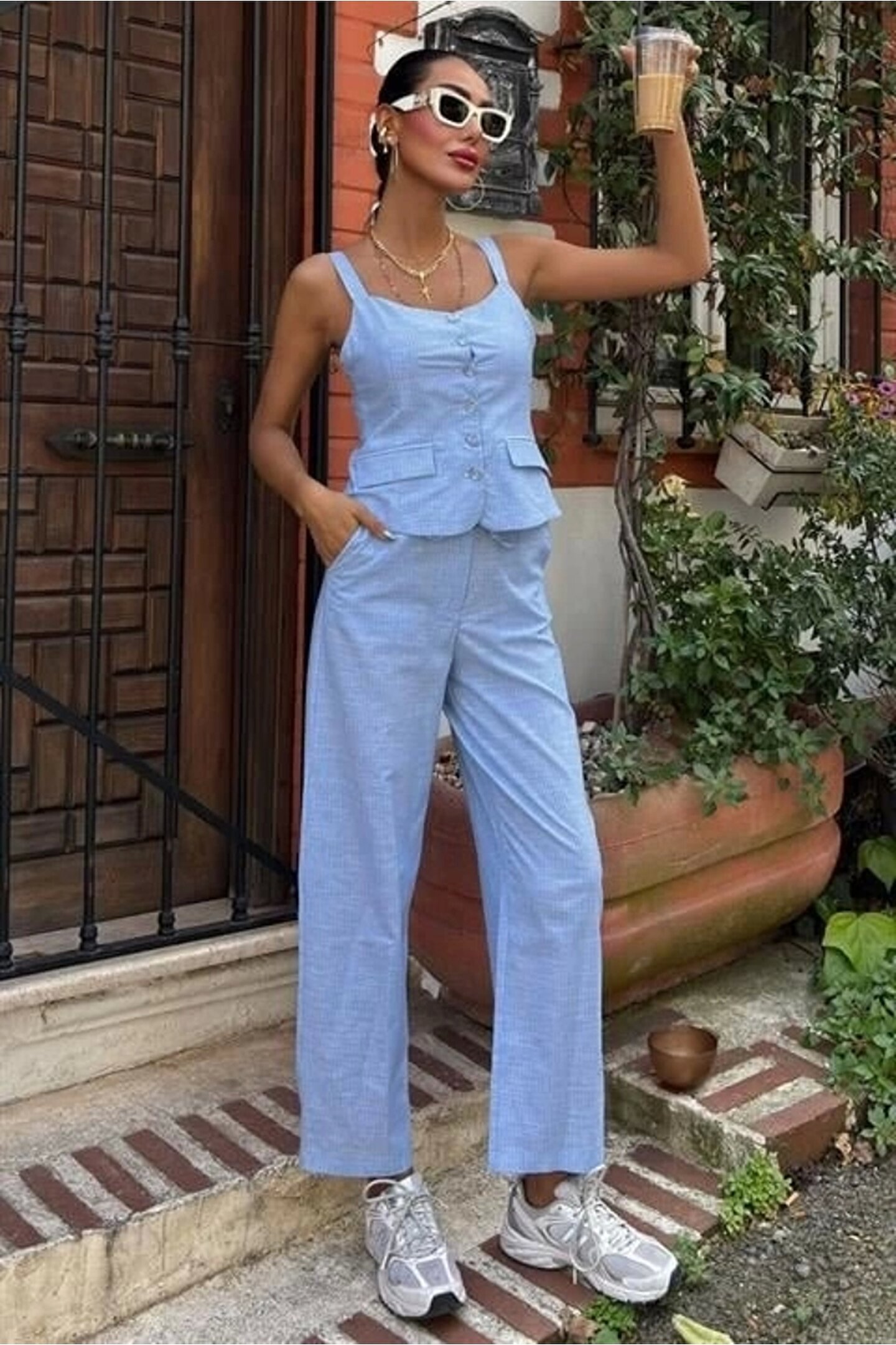 SGM BUTİK Kalın Askılı Bluz Pantolon Keten Takım 10187