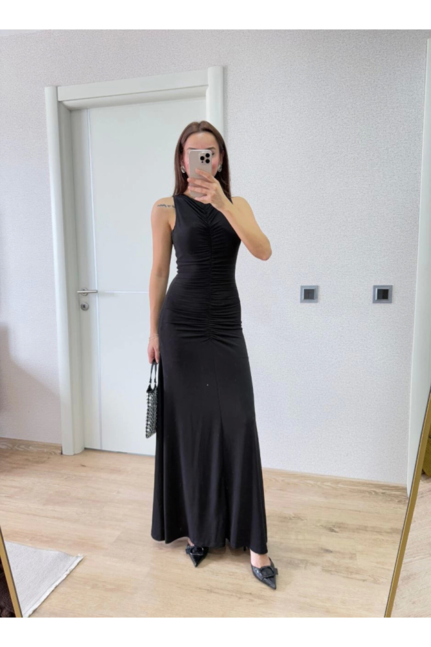Kolsuz Büzgülü Uzun Elbise - Siyah