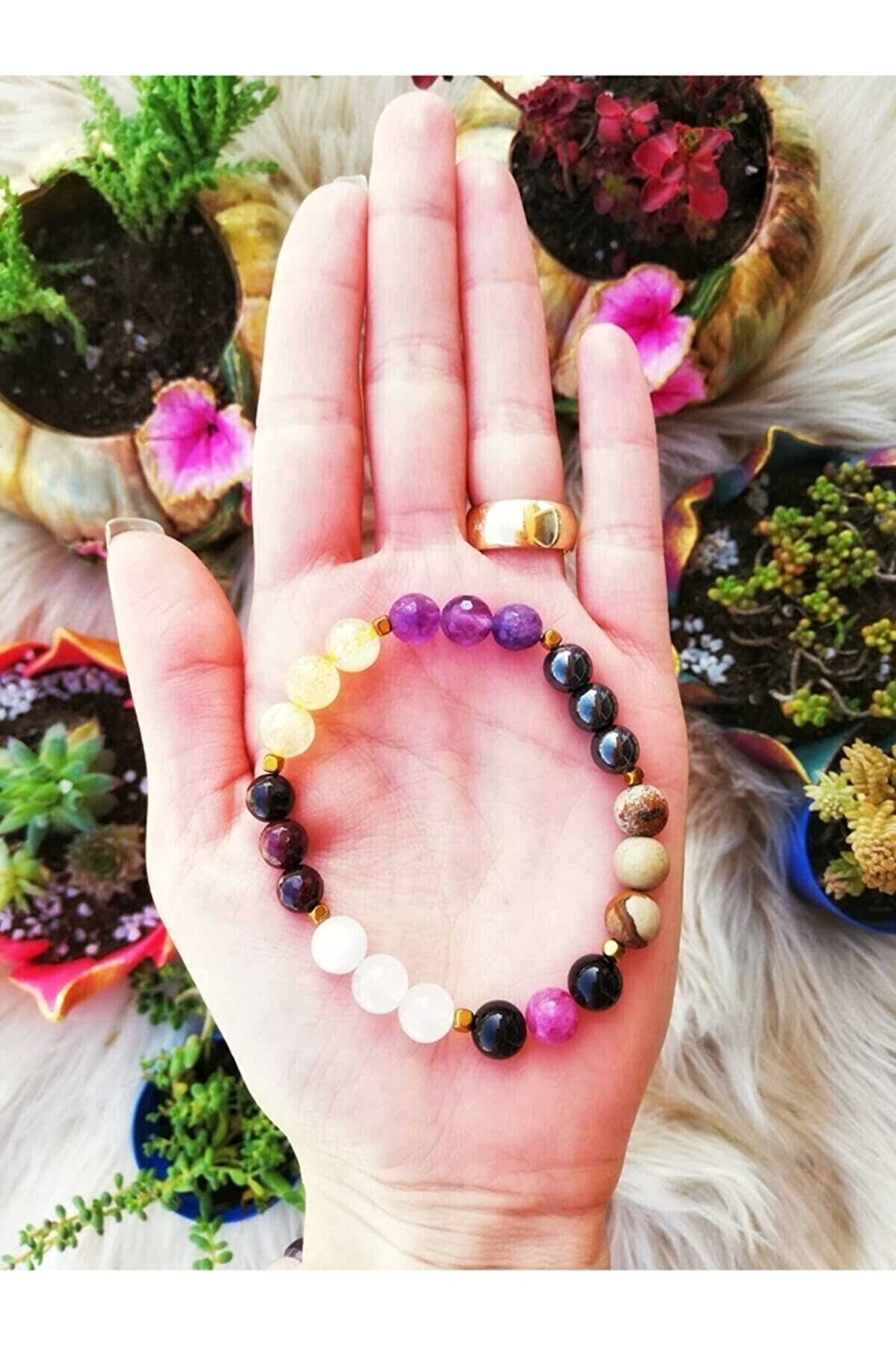 Doğal taş bileklik, Koç burcu için özel olarak tasarlanmış şık ve zarif bir aksesuar seçeneğidir; Ametist, sitrin, hematit, jasper, pembe kuvars, turmalin ve granat lal gibi farklı renklerdeki doğal taşlar, bilekliğe benzersiz bir görünüm kazandırır; Her bir bileklik, el yapımı olup, her bir parçanın benzersizliği ve kalitesi ile öne çıkar; Doğal taş materyali sayesinde hem dayanıklı hem de estetik bir kullanım sunar;