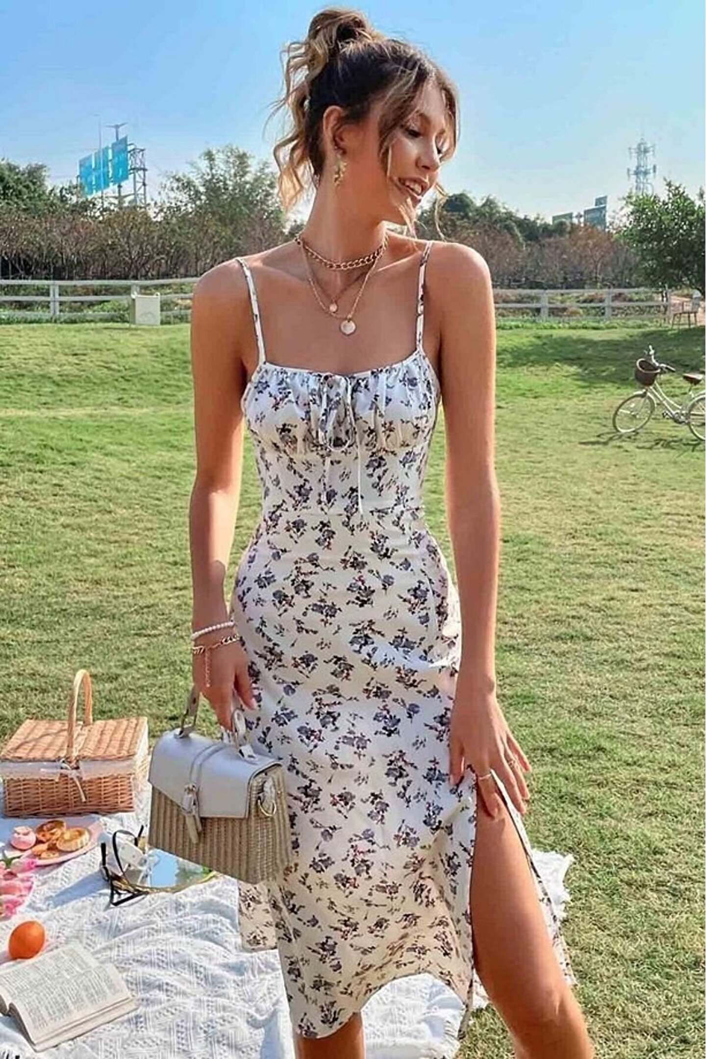 shopivastore EQURİ Kadın Ip Askılı Yakadan Bağcıklı Desenli Süprem Elbise