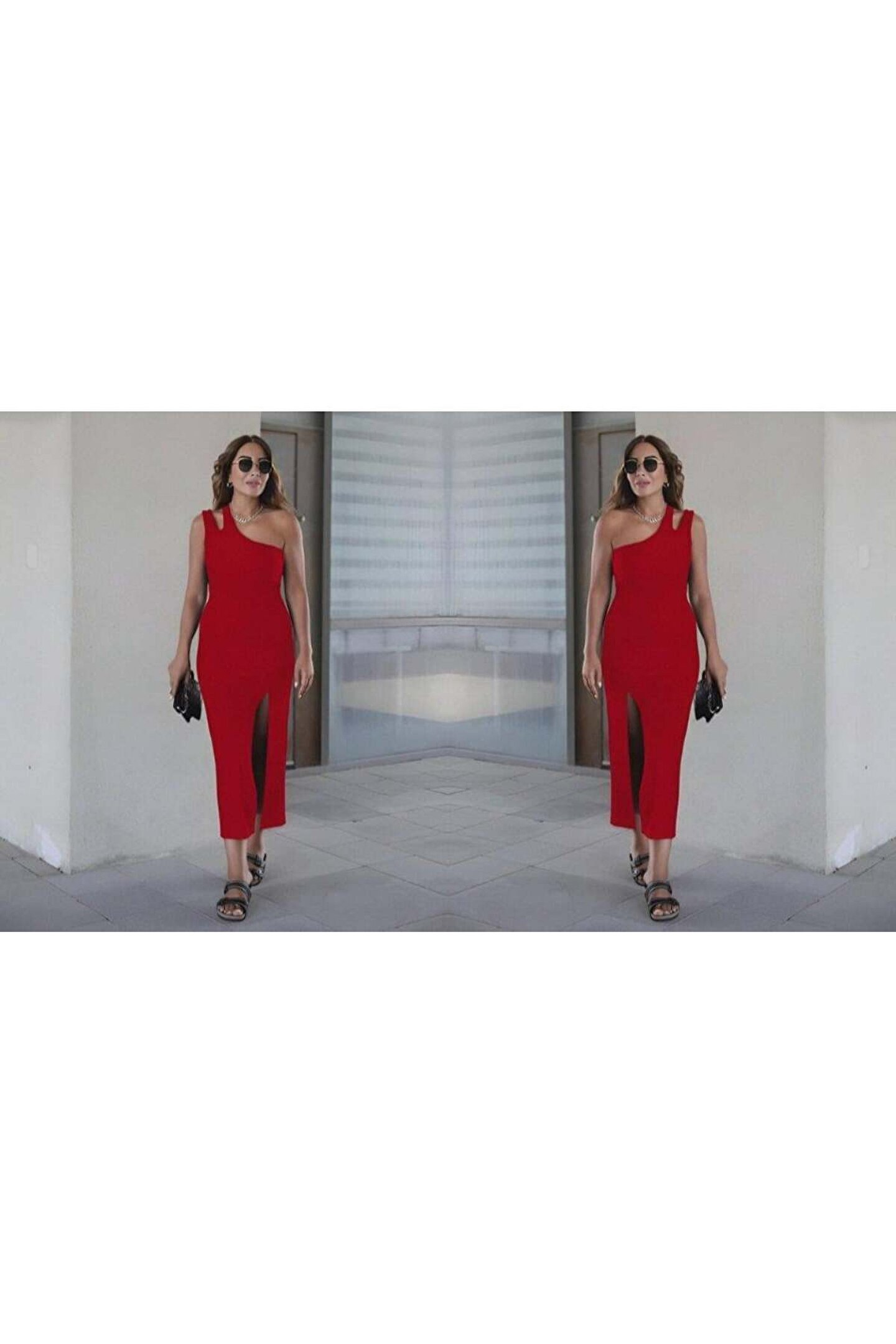 shopivastore Kadın Kolsuz Tek Omuz Damla Detay JanJan Krep Elbise