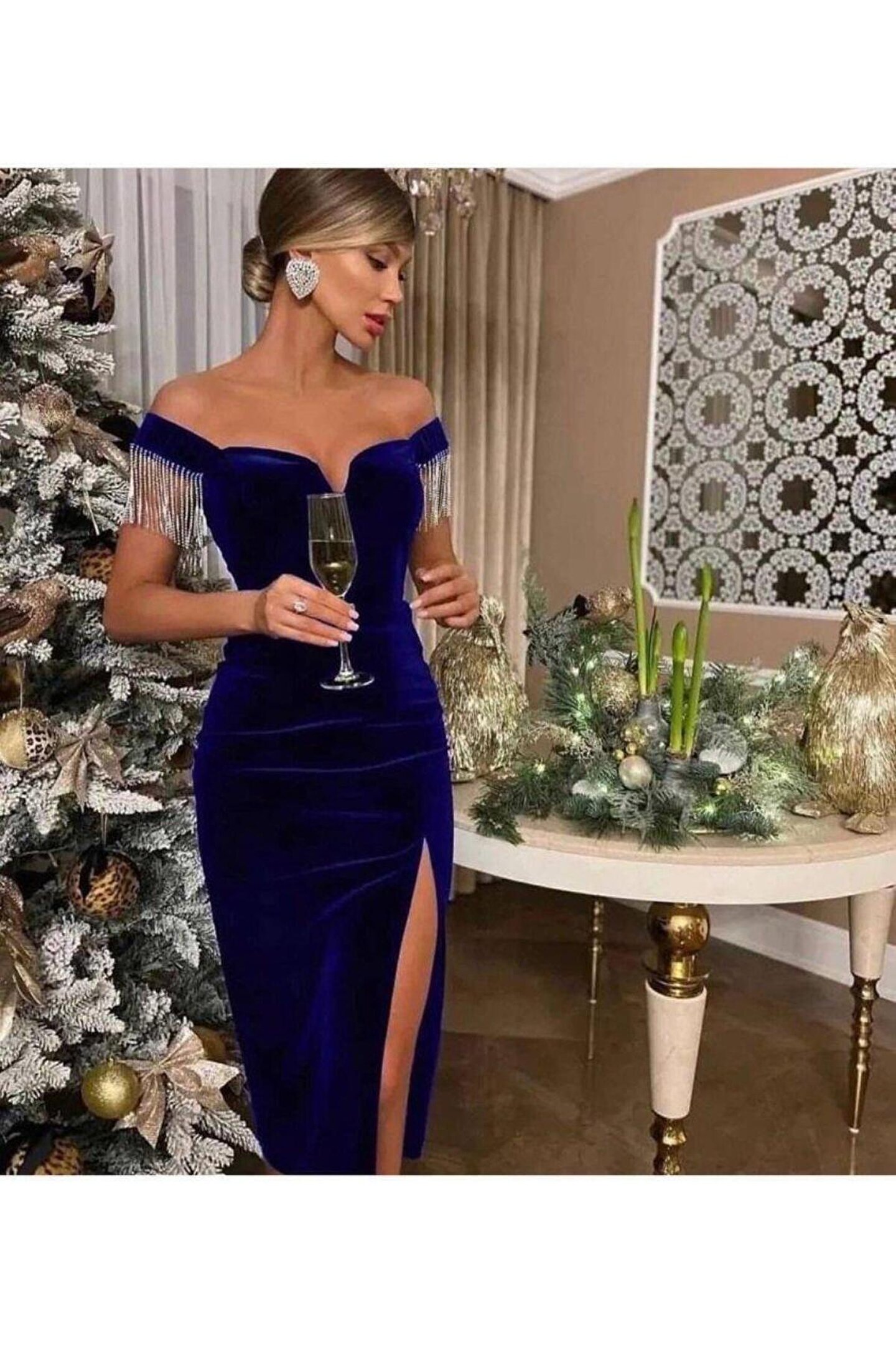 Kadın Omuz Askılı Zincir Detay Maxi Boy Yırtmaçlı Kadife Elbise