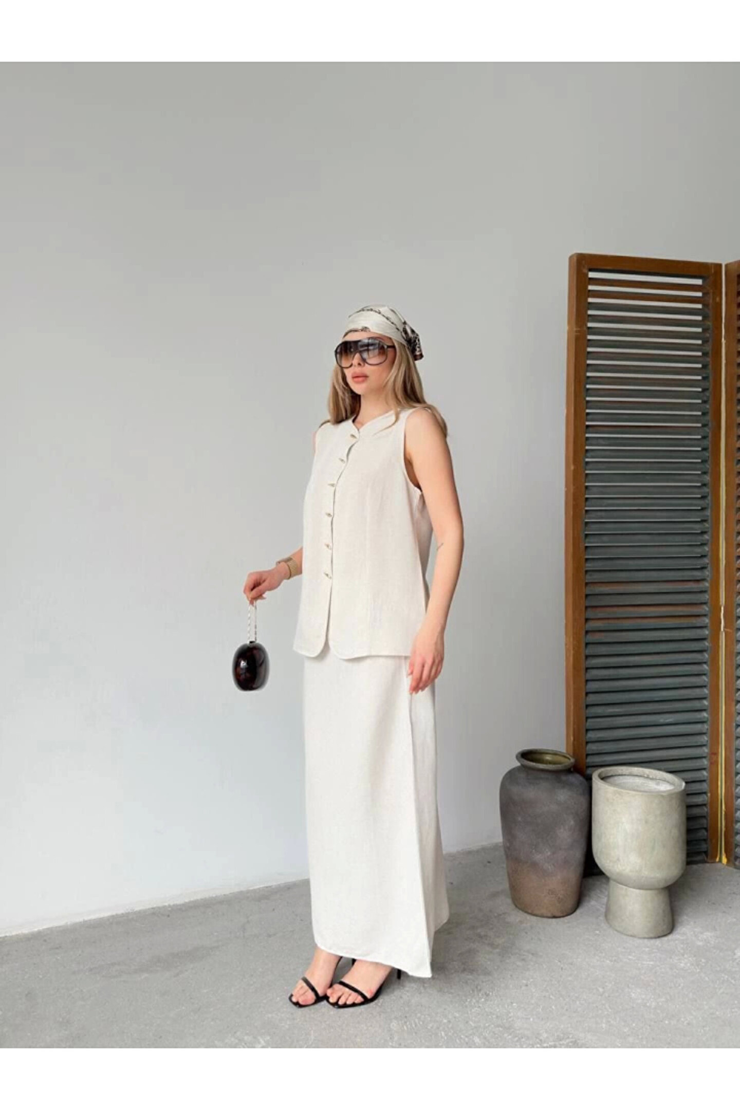 Keten Kolsuz Hırka Etek Ikili Takım- Beyaz