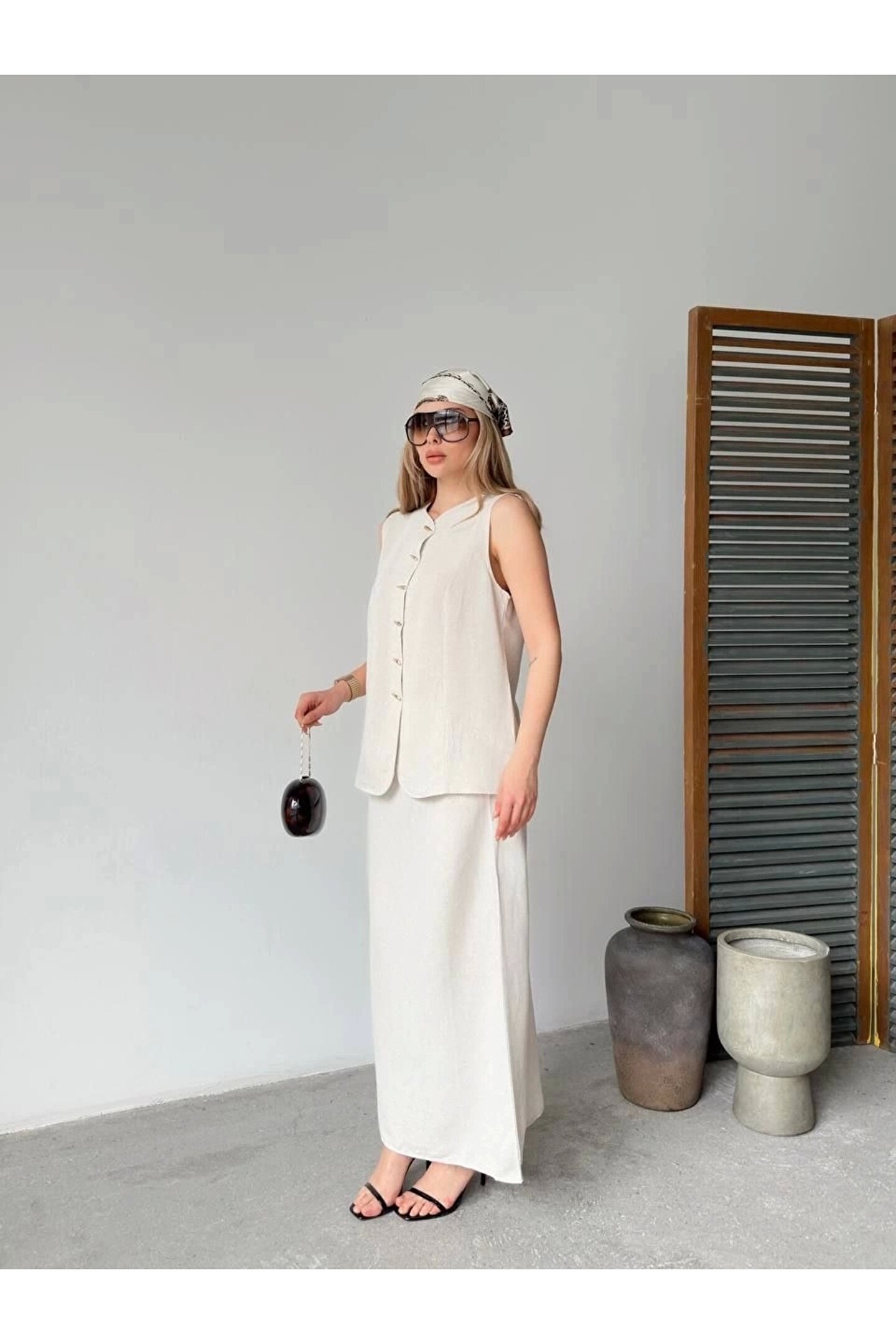 shopivastore Keten Kolsuz Sıfır Yaka İlik Düğmeli Kolsuz Hırka Etek ikili Takım- Beyaz