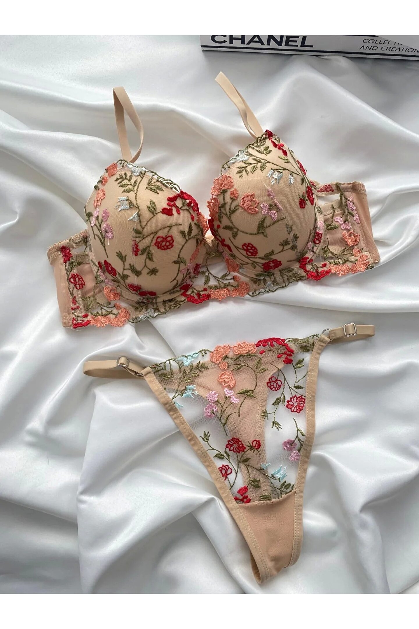Ürün Detayları Destekli-Balenli-Kaplı-Telli Adelina Brode Takım Zarafetinizi ortaya çıkarın ve Adelina koleksiyonu ile doğanın güzelliğini üzerinizde taşıyın.; İnce detaylarla işlenmiş bu özel tasarım, zarif çiçek motifleri ile lüks işçiliği bir araya getiriyor.; Hafif tül panelleri ve yumuşak nude tonları, teninize dokunan neredeyse hissedilmeyen bir rahatlık sunarken, vücudunuzu renk ve dokuların senfonisiyle kucaklıyor.; Adelina doğal hatlarınızı vurgulayarak hem feminen hem de zamansız bir görünüm yaratıyor.; Rahatlık kadar şıklık da göz önünde bulundurularak tasarlanan bu koleksiyonda, ayarlanabilir askılar ve özenle hazırlanmış kesim mükemmel bir uyum sağlıyor.; Takımla uyumlu tanga ise romantik ve kusursuz bir silueti tamamlıyor.