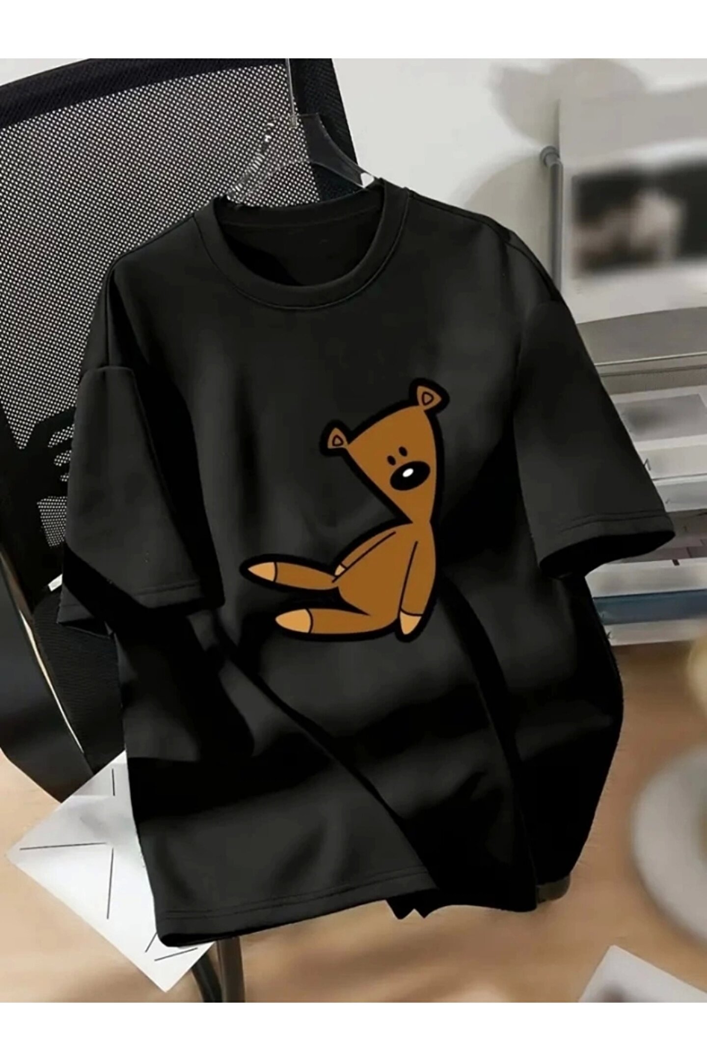 Baskılı Oversize Bisiklet Yaka T-shirt - Siyah
