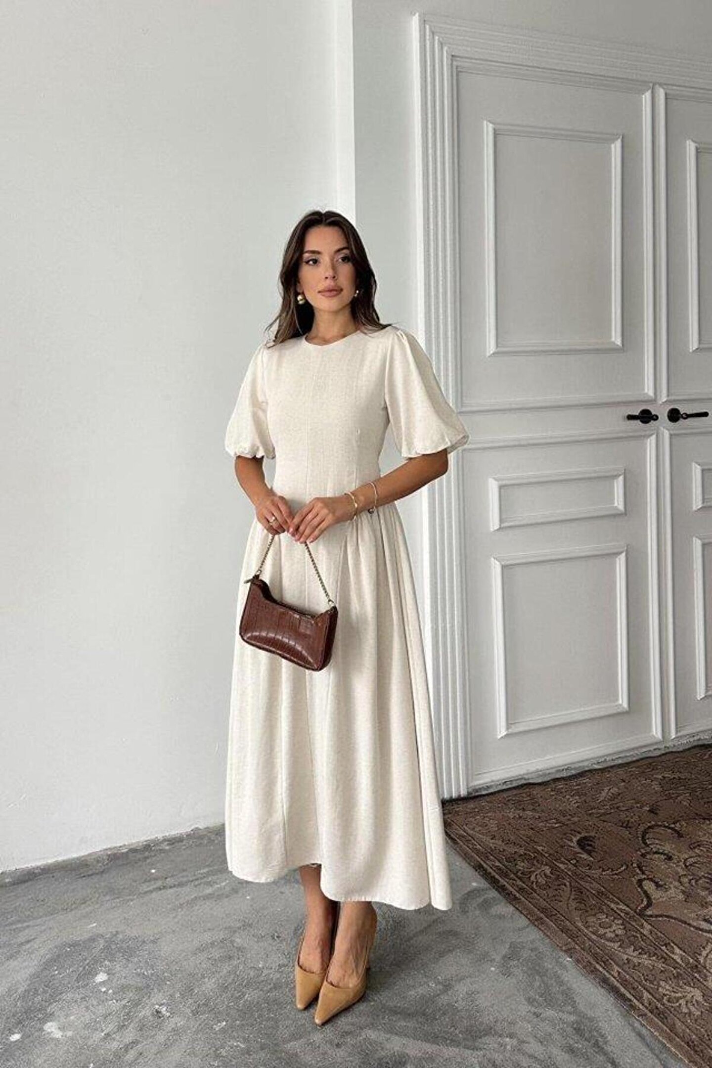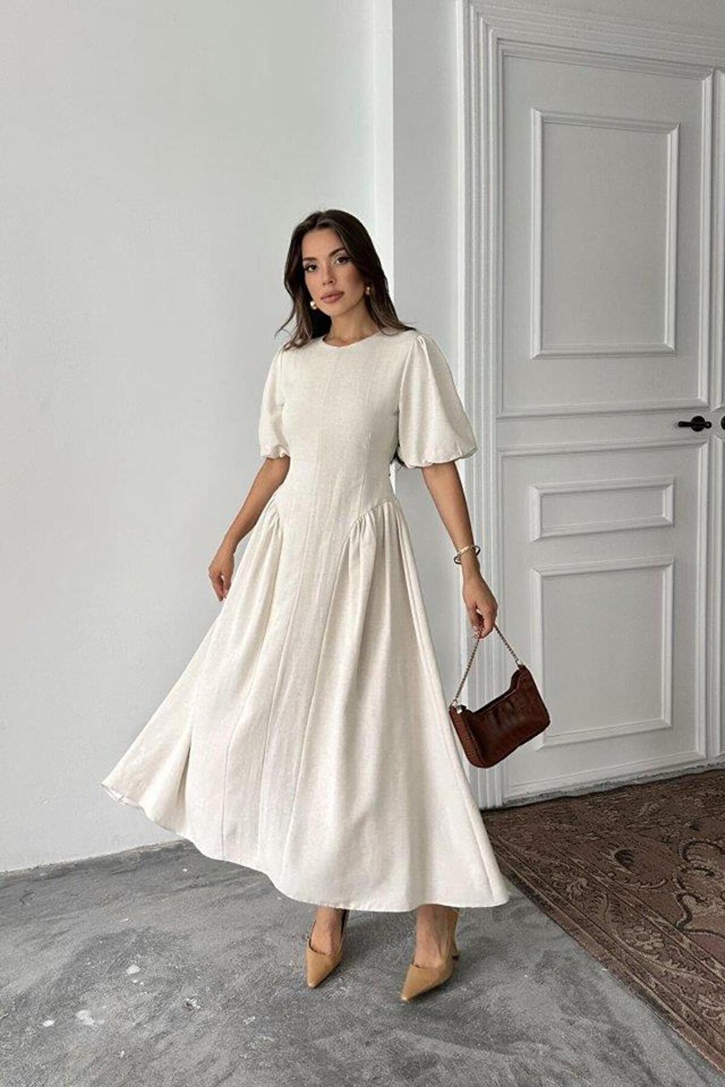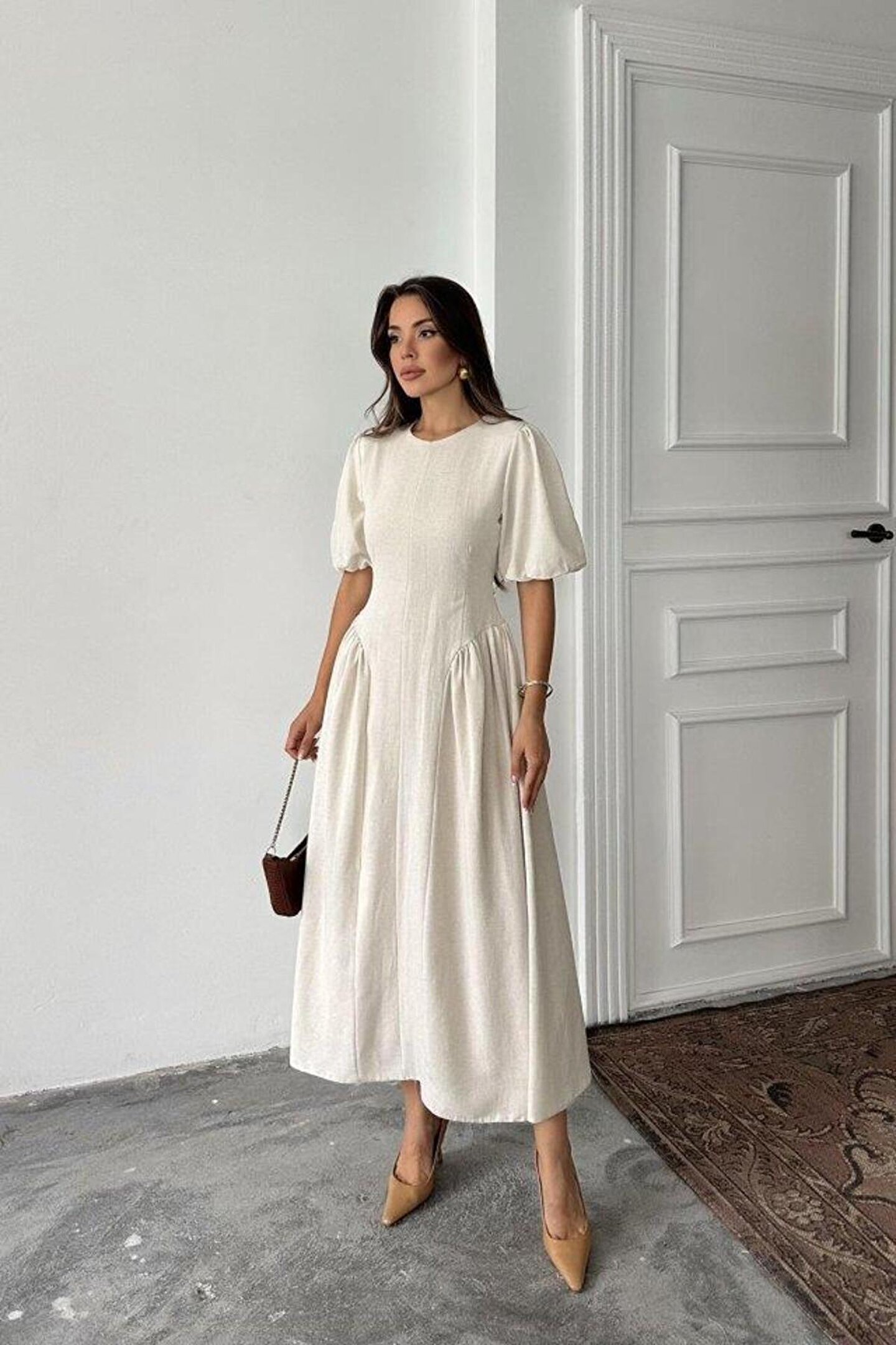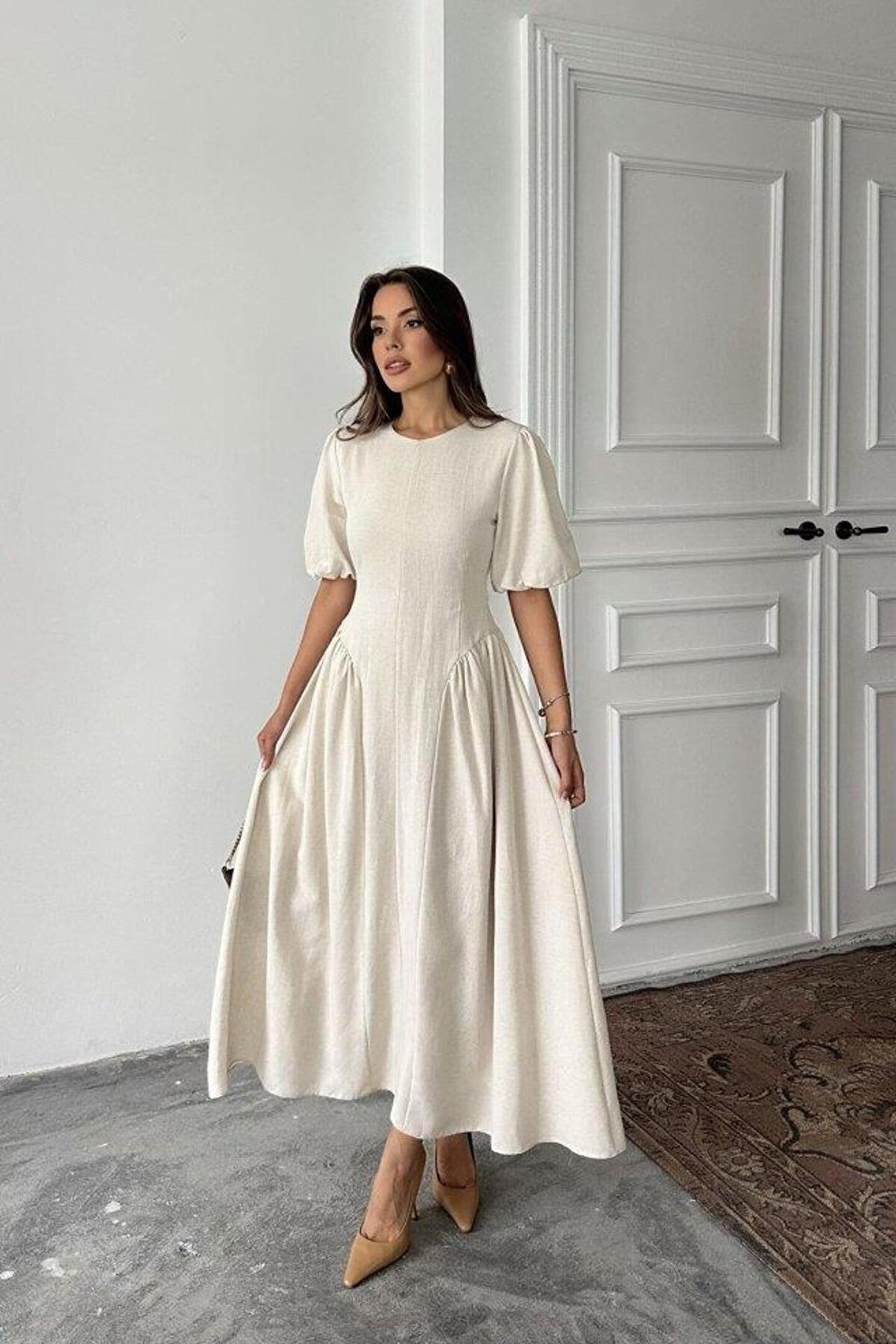 Silerra Bej Arkadan Bağlamalı Büzgülü Keten Elbise