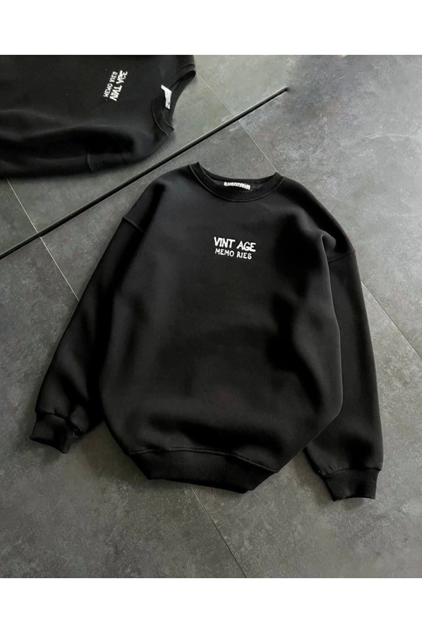Bisiklet Yaka Üç İplik Baskılı Oversize SweatShirt - Siyah
