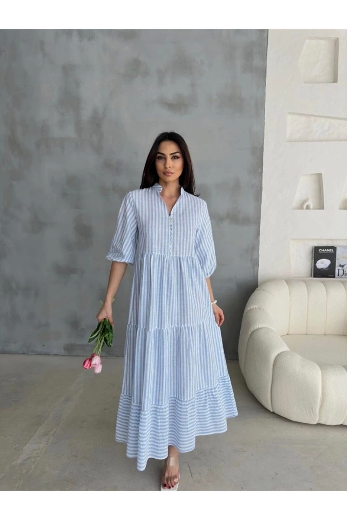 ÇİZGİLİ KETEN HAKİM YAKA DÜĞMELİ SALAŞ ELBİSE - Mavi