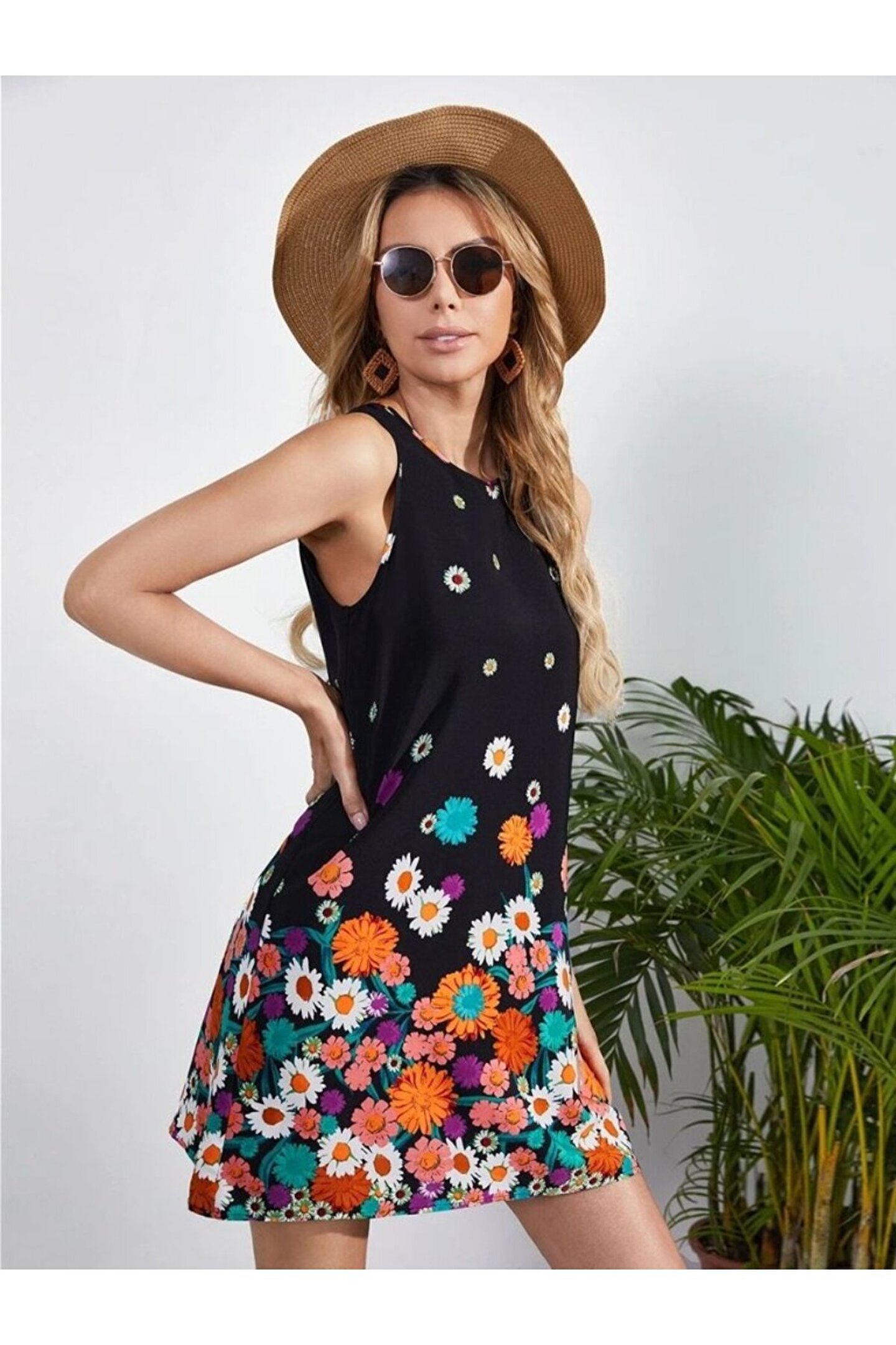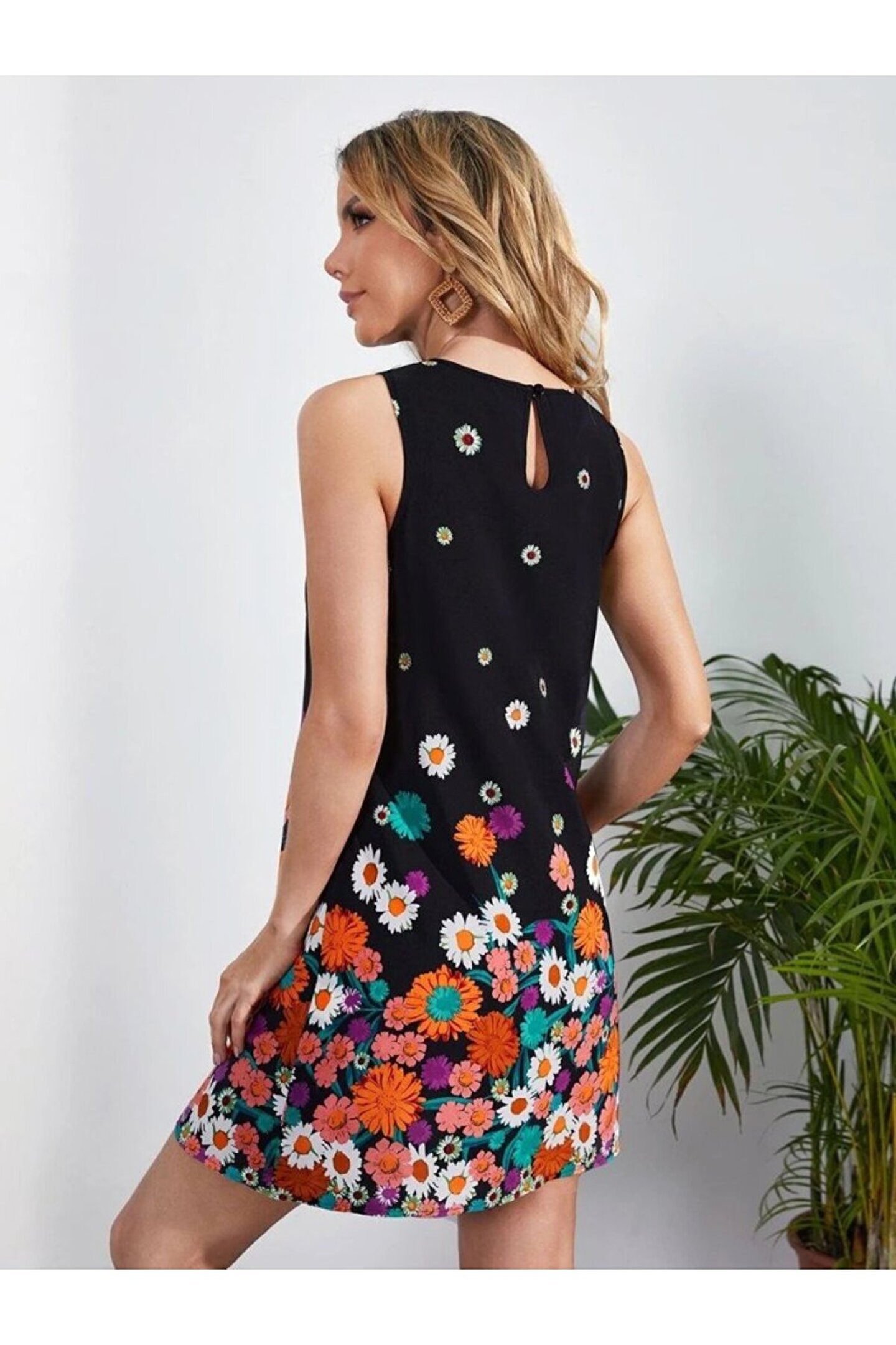 Kadın Sıfır Kollu Bisiklet Yaka çiçek Desenli Süprem Mini Elbise