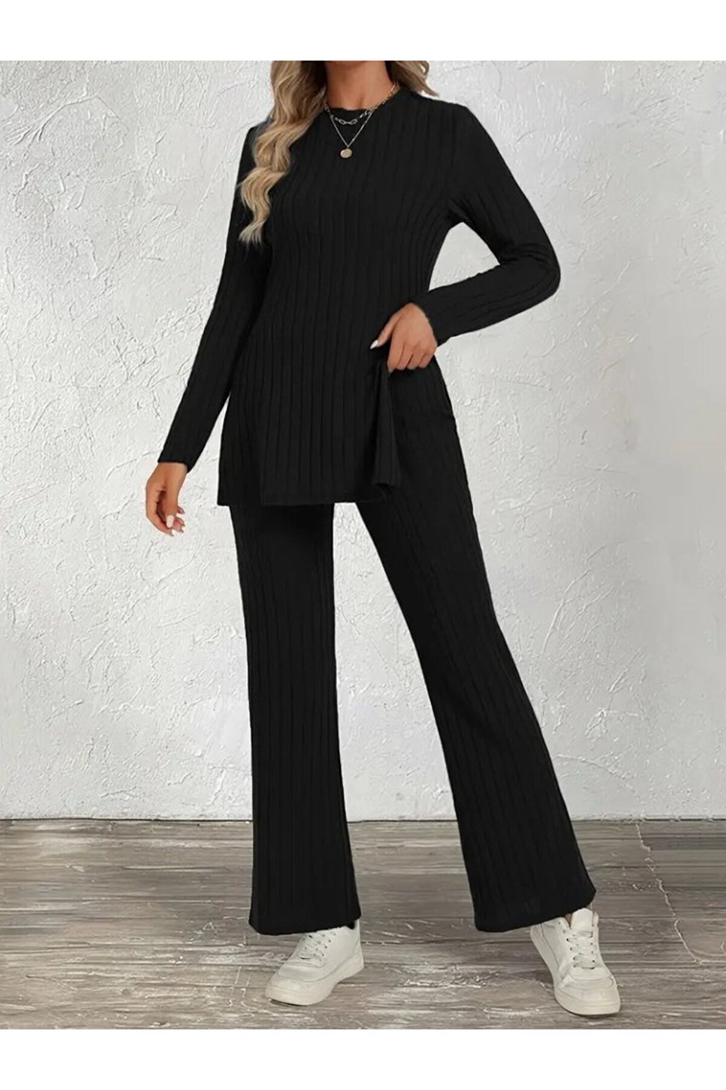 Kadın Uzun Kollu Bisiklet Yaka Yandan Yırtmaçlı şardonlu Kaşkorse Bluz Ve Pantolon Ikili Takım