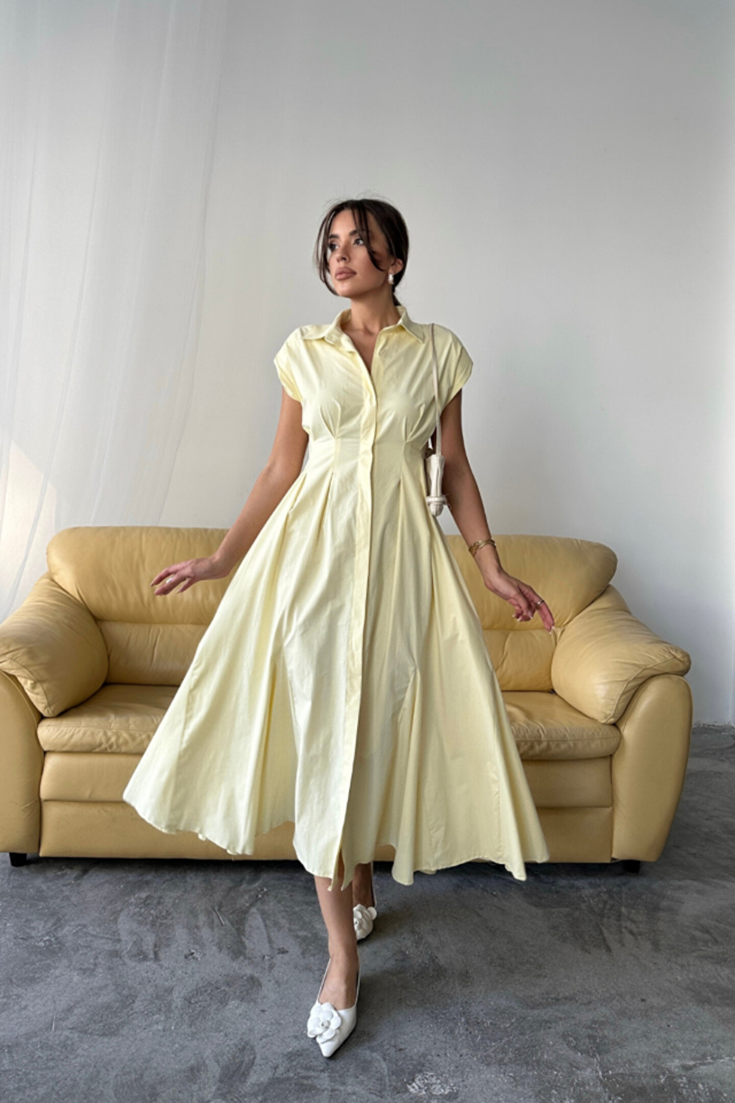 EQURİ KOLSUZ VATKALI ÖNDEN DÜĞMELİBEL PENS DETAYLI POPLİN ELBİSE - Sarı