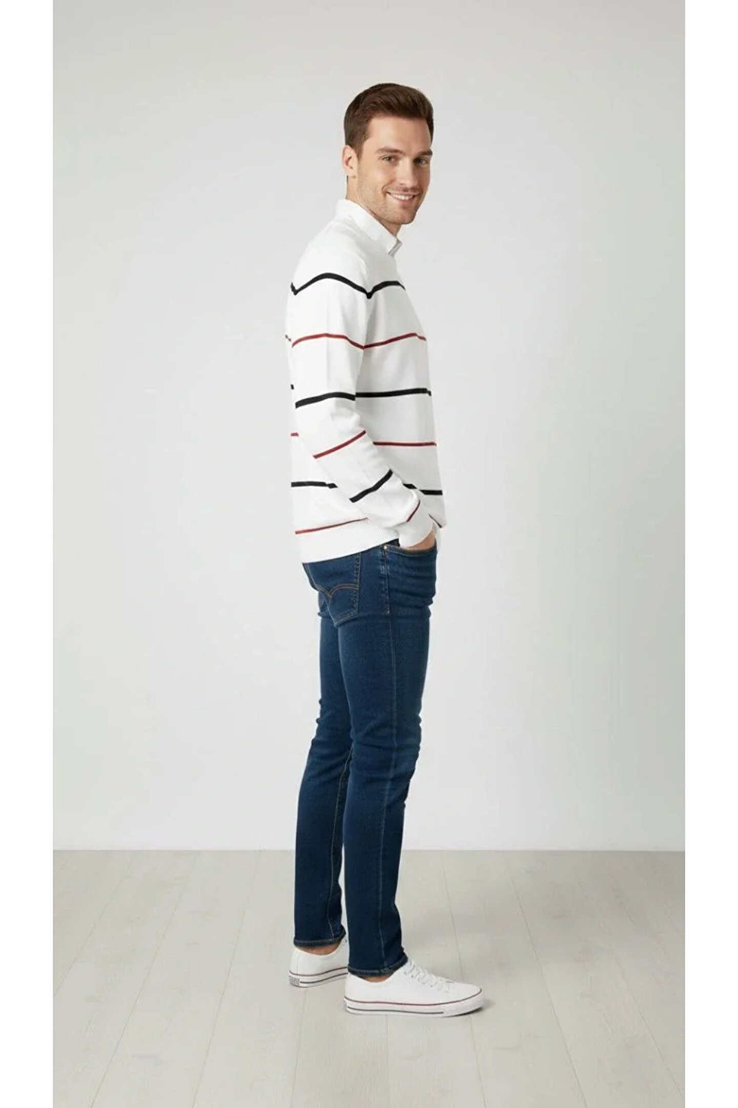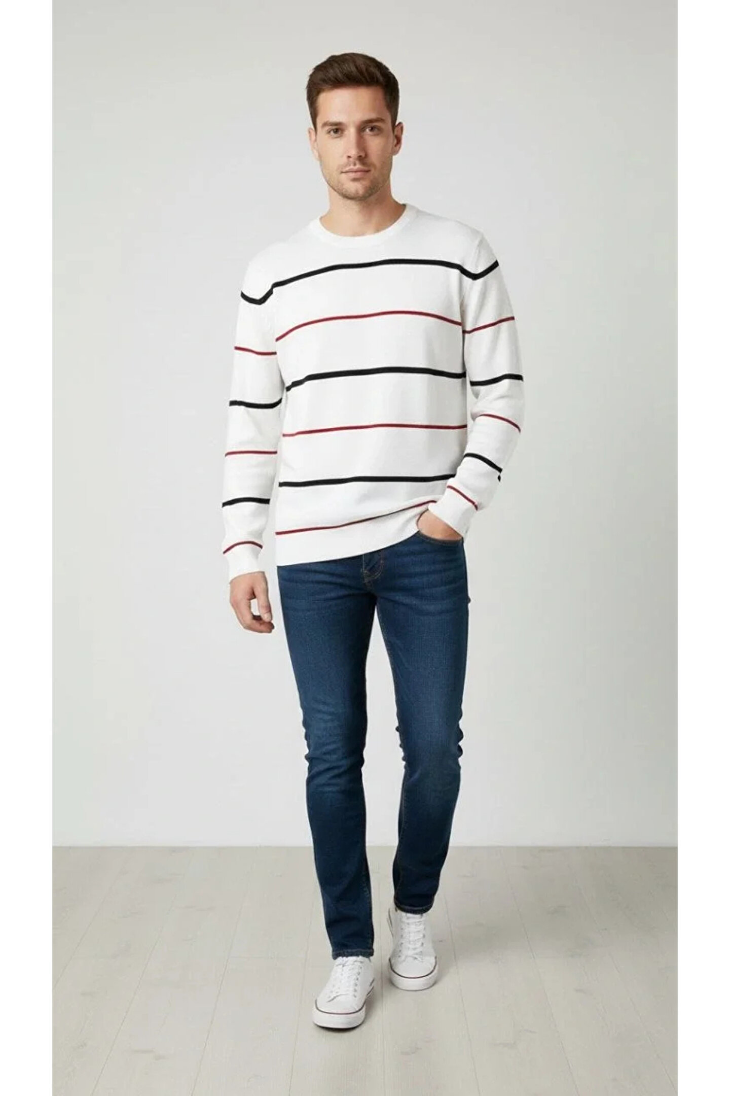 Silerra Erkek Bisiklet Yaka Cizgili Triko Kazak yumuşak dokulu Pamuklu ince Dokuma, uzun kollu Rahat Regular