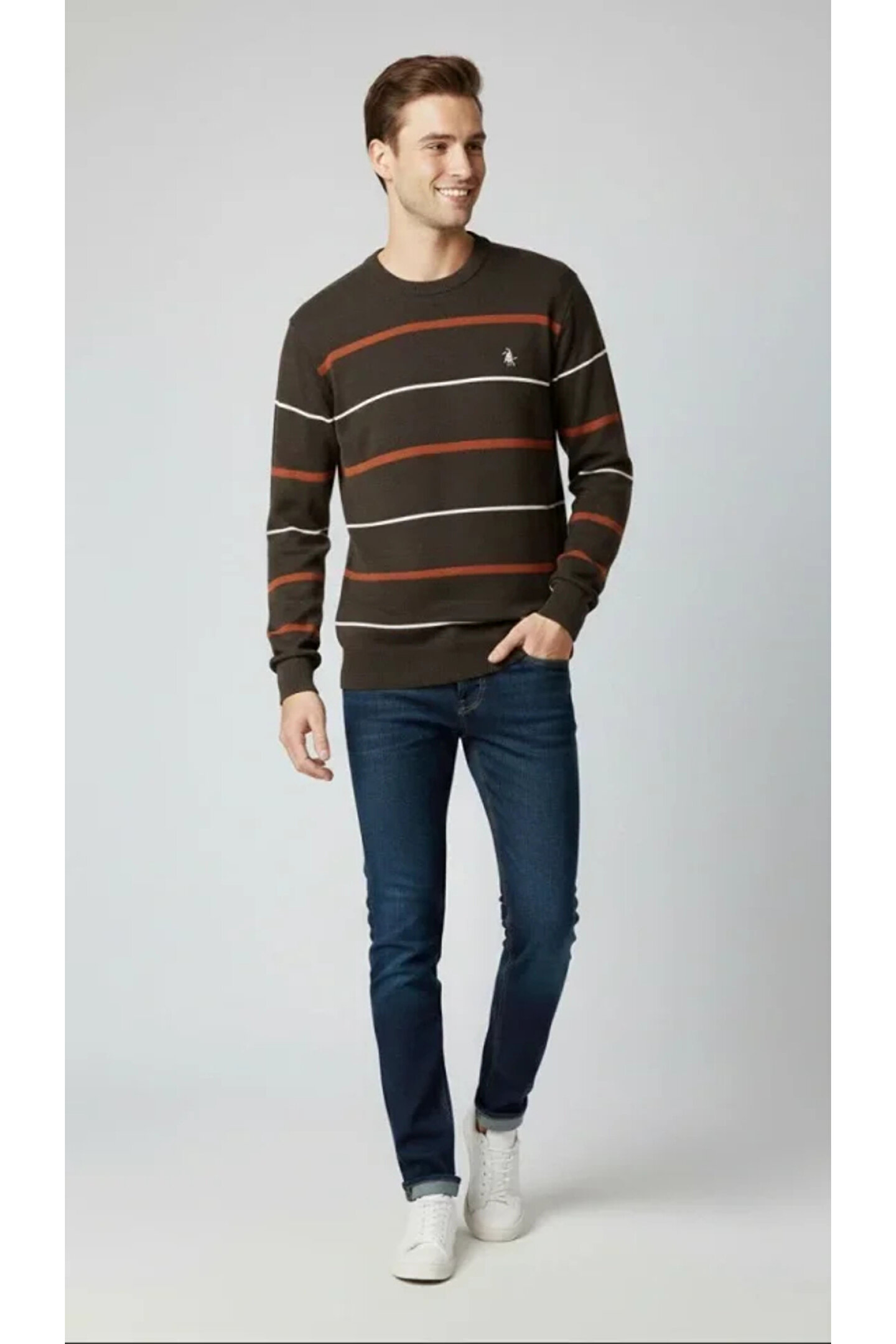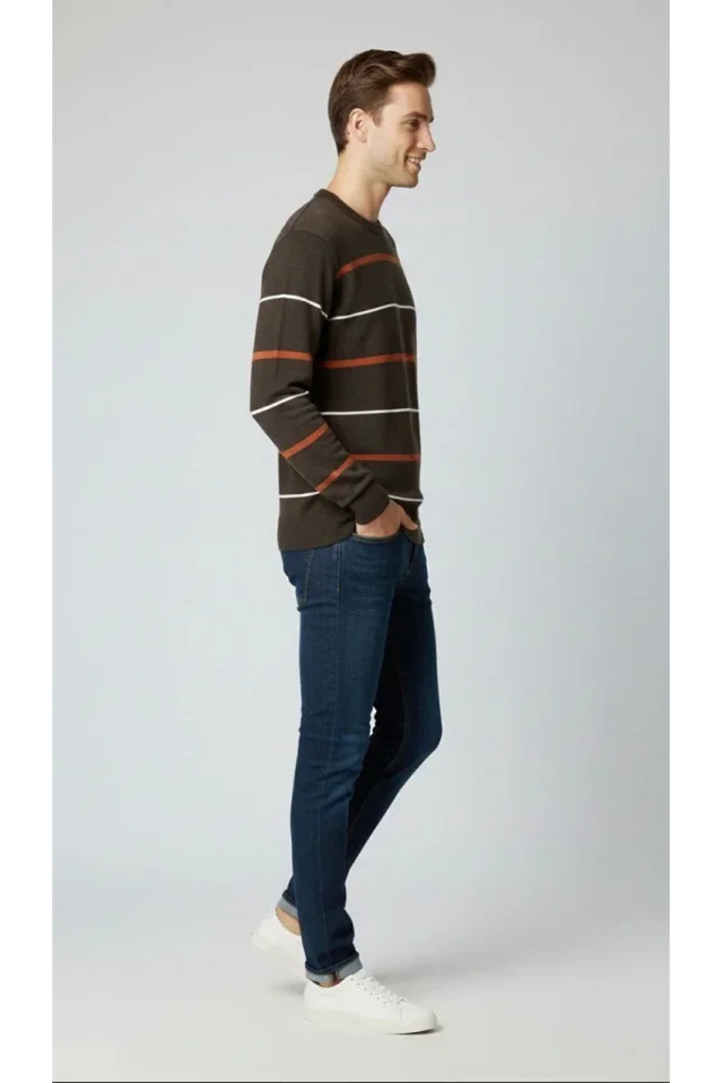 Erkek Bisiklet Yaka Cizgili Triko Kazak Yumuşak Dokulu Pamuklu Ince Dokuma, Uzun Kollu Rahat Regular Kalıp - Koyu Kahverengi