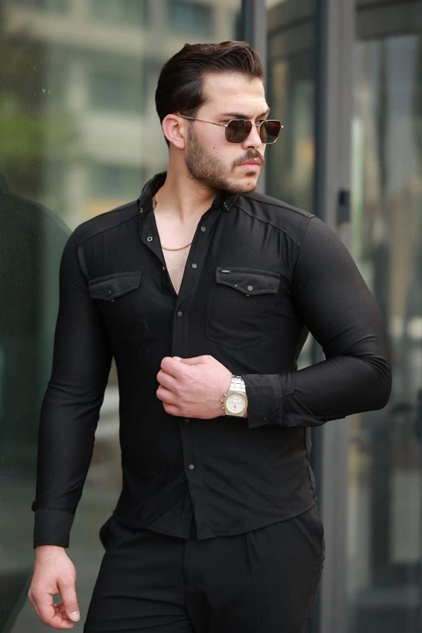 Erkek çift Cepli çıtçıt Düğmeli Uzun Kollu Gömlek