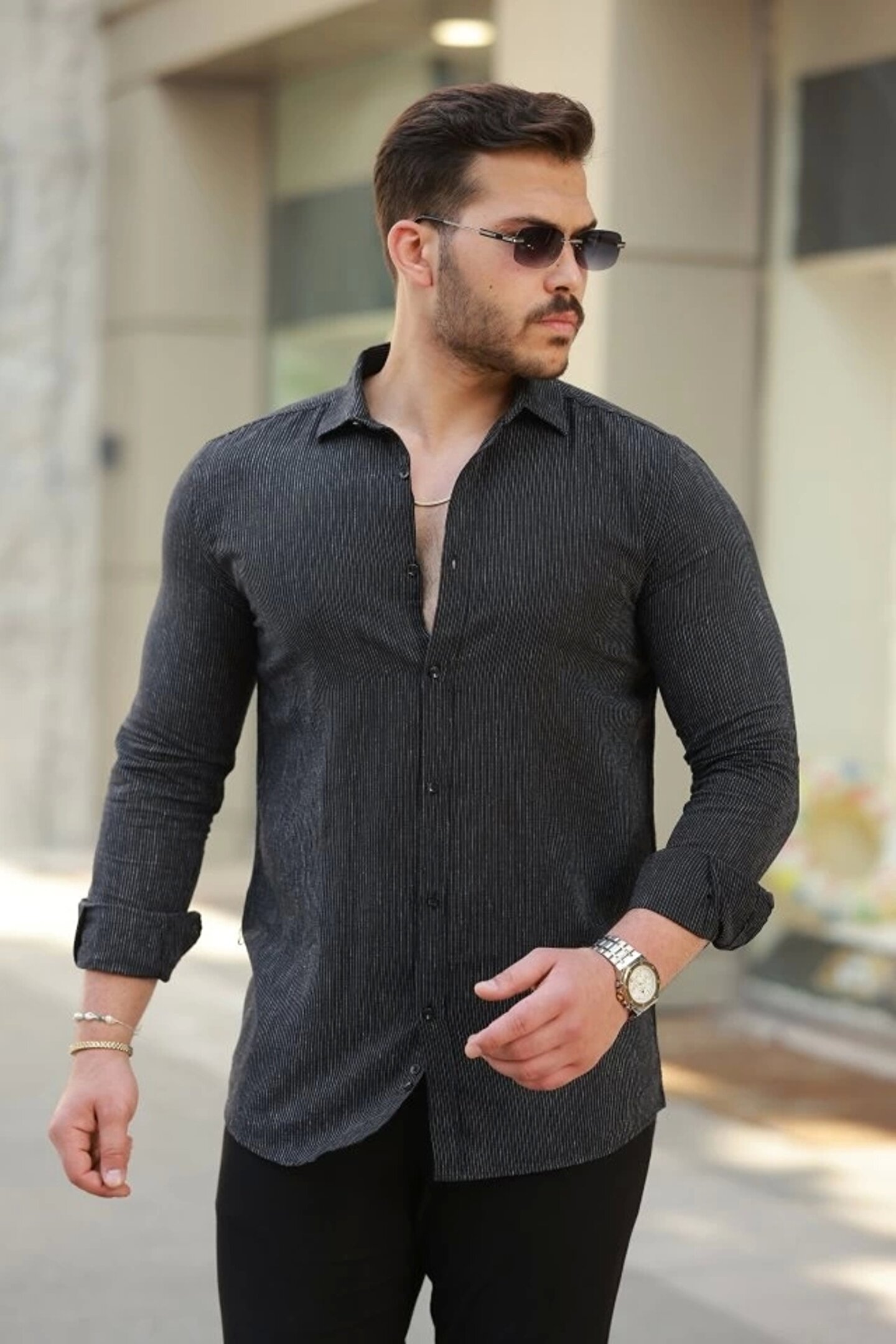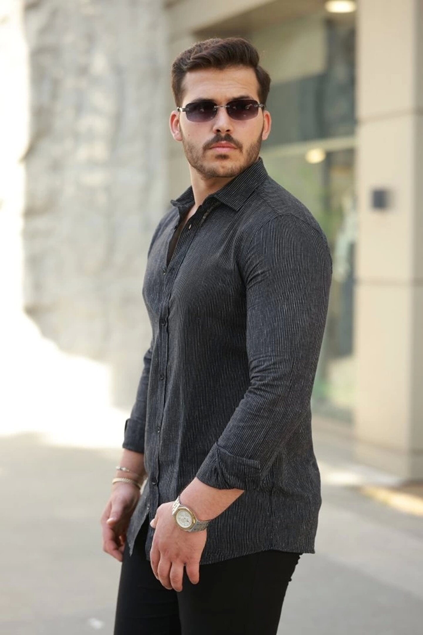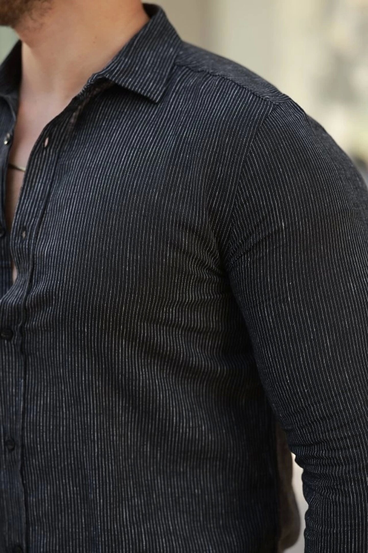 Erkek çizgi Desenli Uzun Kollu Pamuklu Keten Gömlek