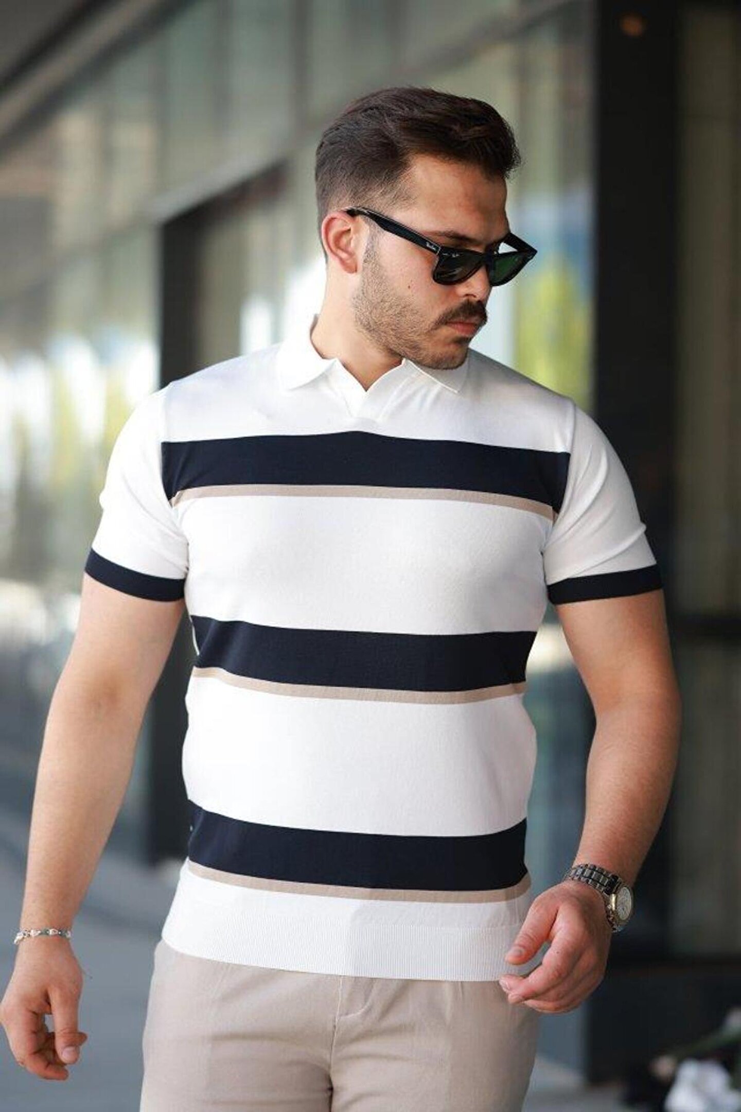 Erkek şerit Desenli Hemşire Yaka Kısa Kollu Tişört
