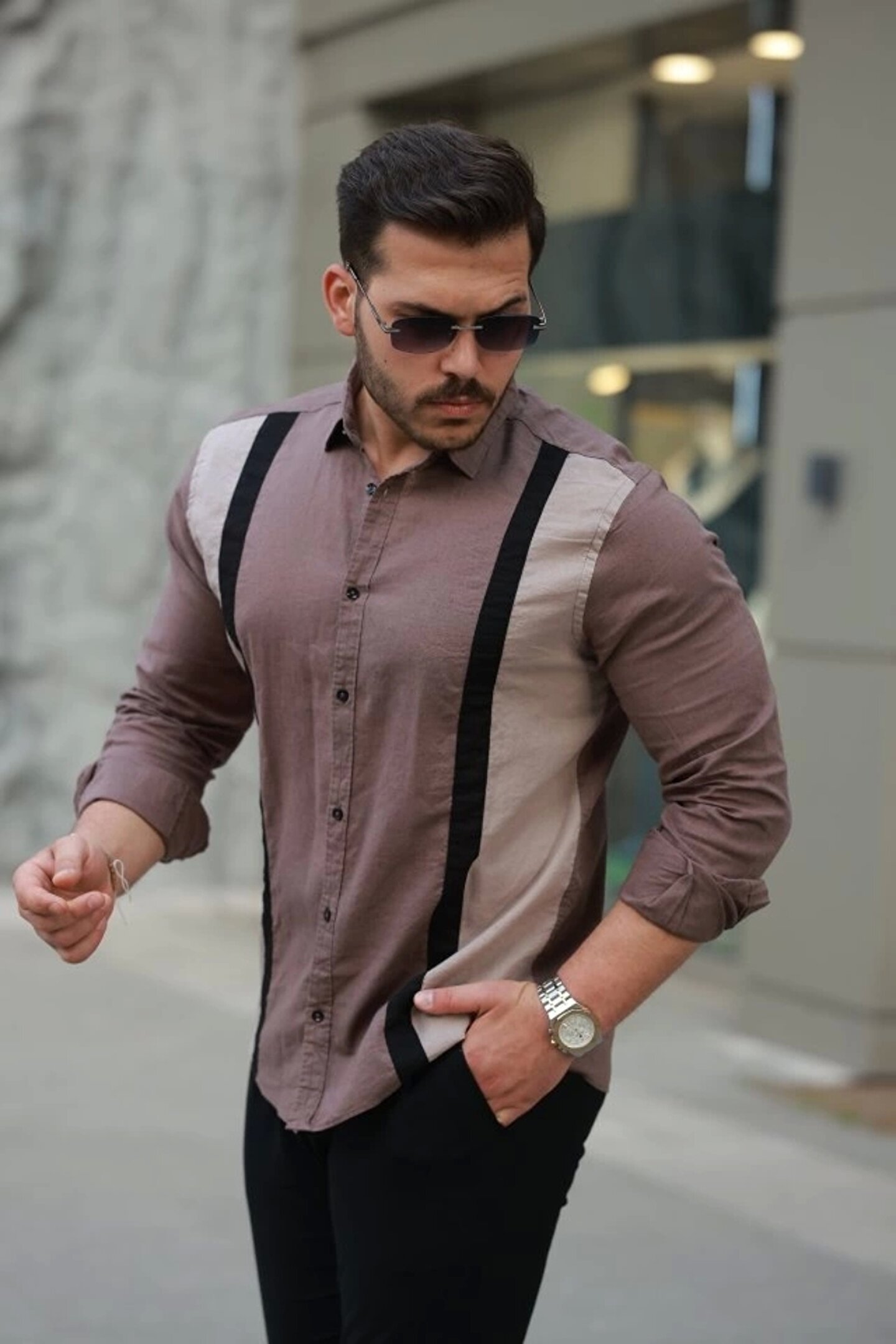 Erkek şerit Detaylı Uzun Kollu Pamuklu Keten Gömlek