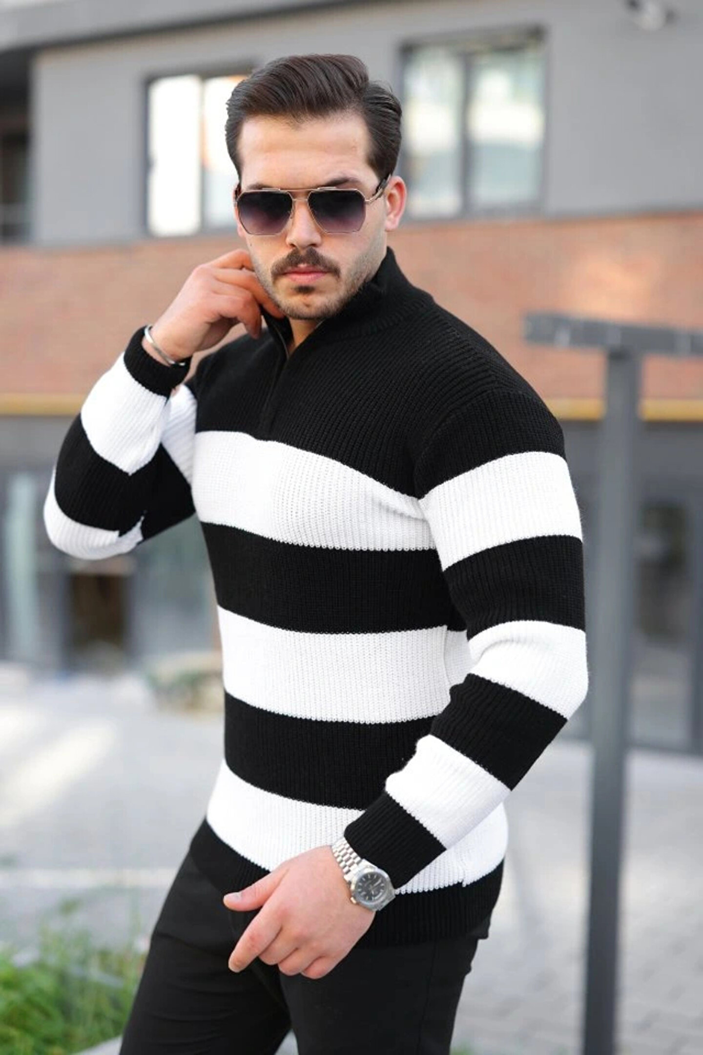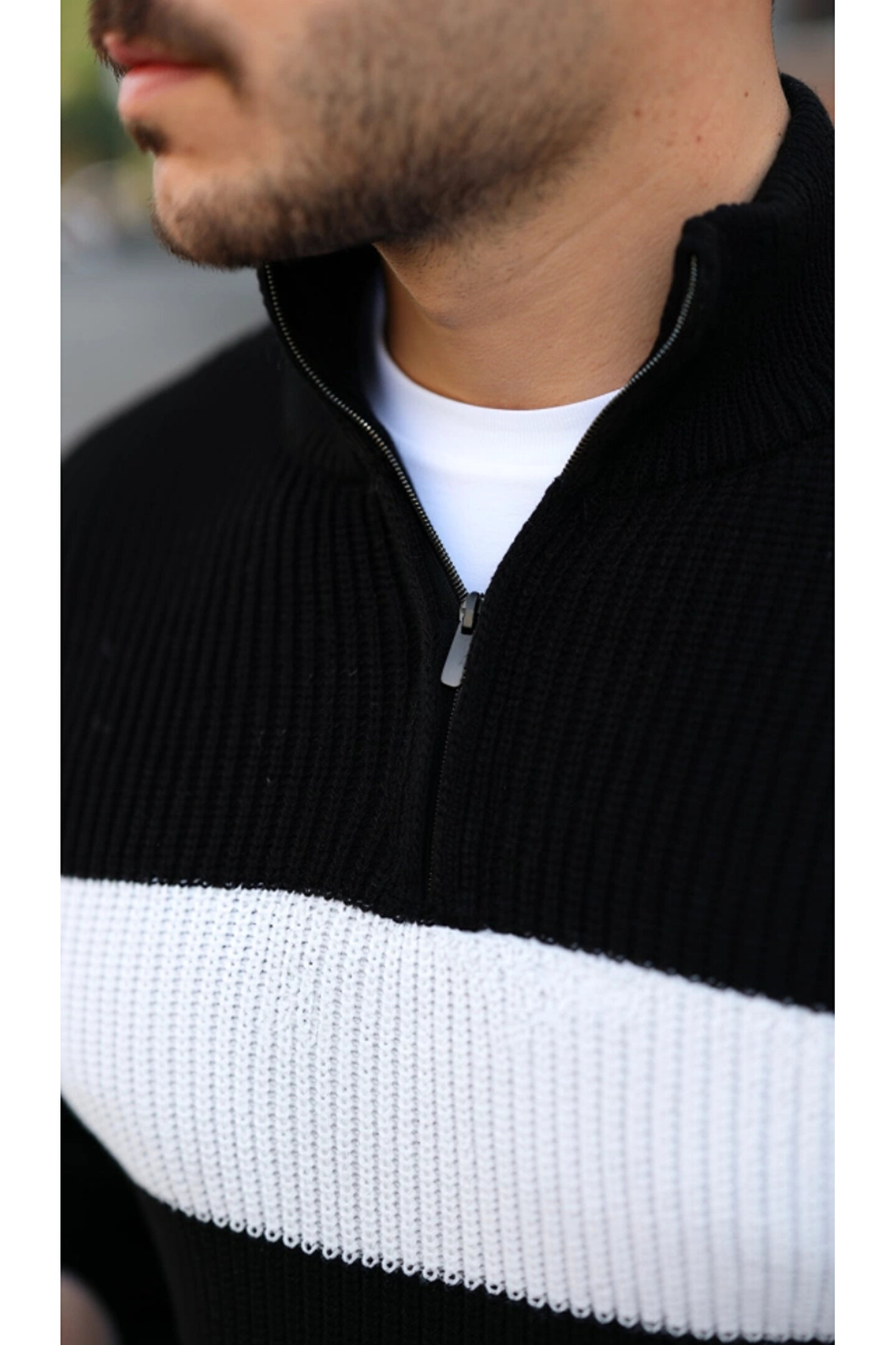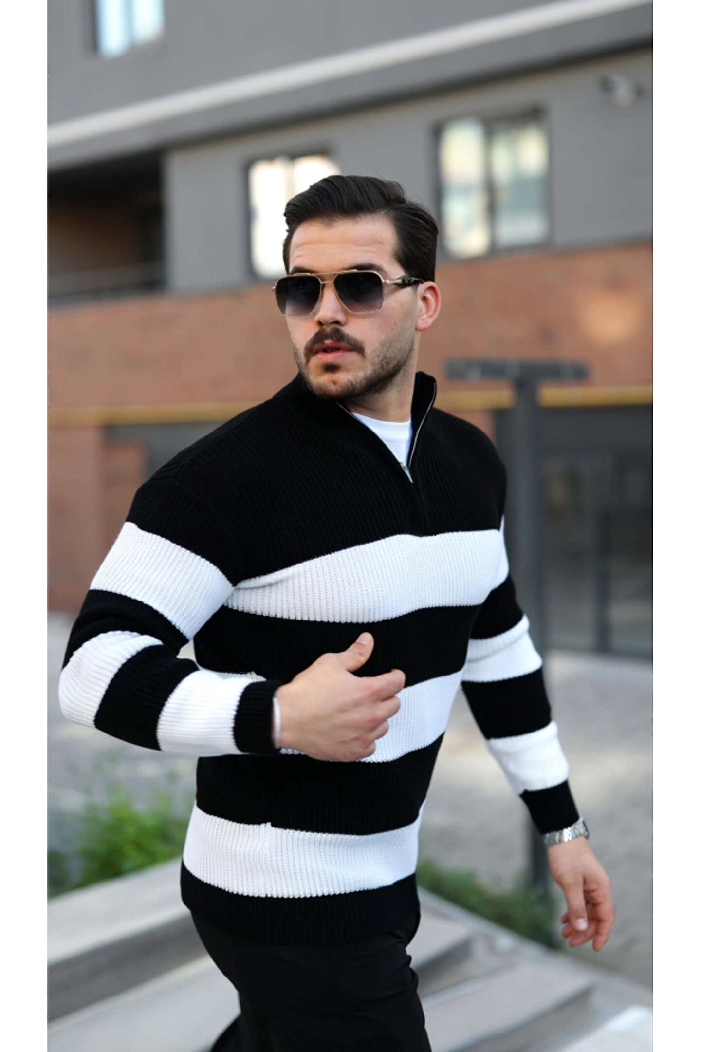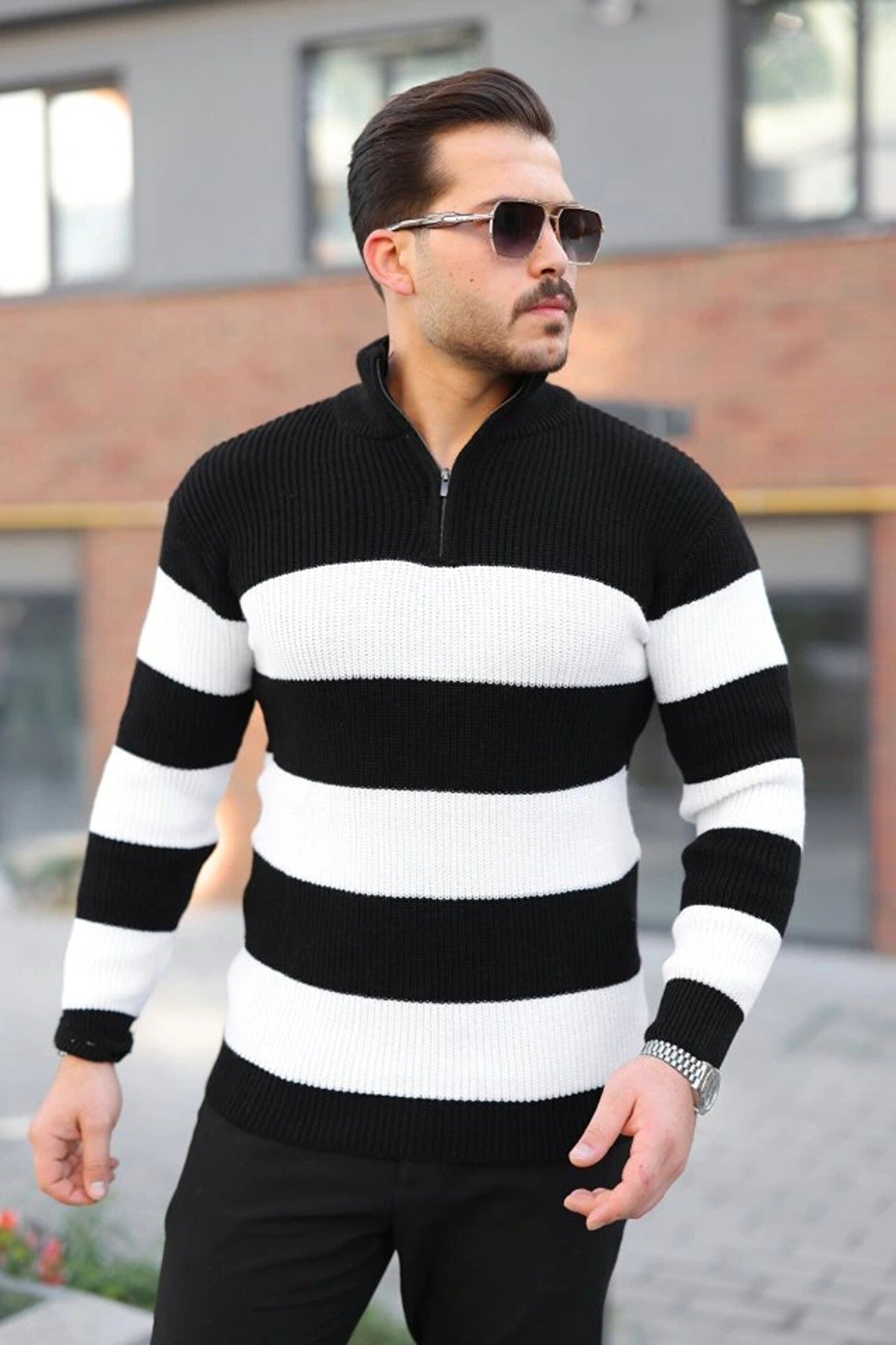 Erkek Şerit Renk Desenli Zip Yaka Kazak