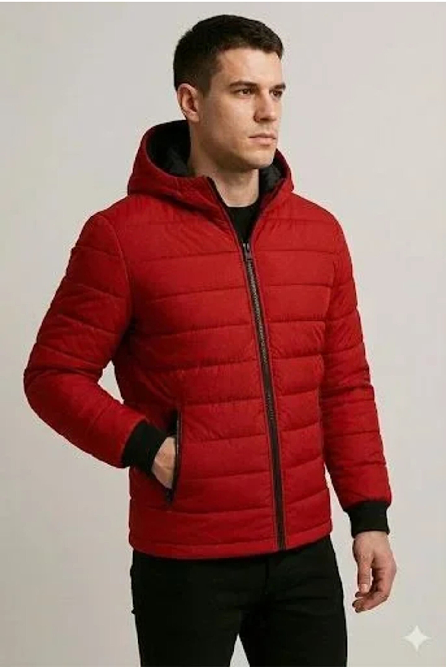 Erkek Şişme Kapüşonlu Fermuarlı Mont Su Itici Kapitone Astarlı Kumaş Cepli Kışlık Rahat Kalıp - Kırm