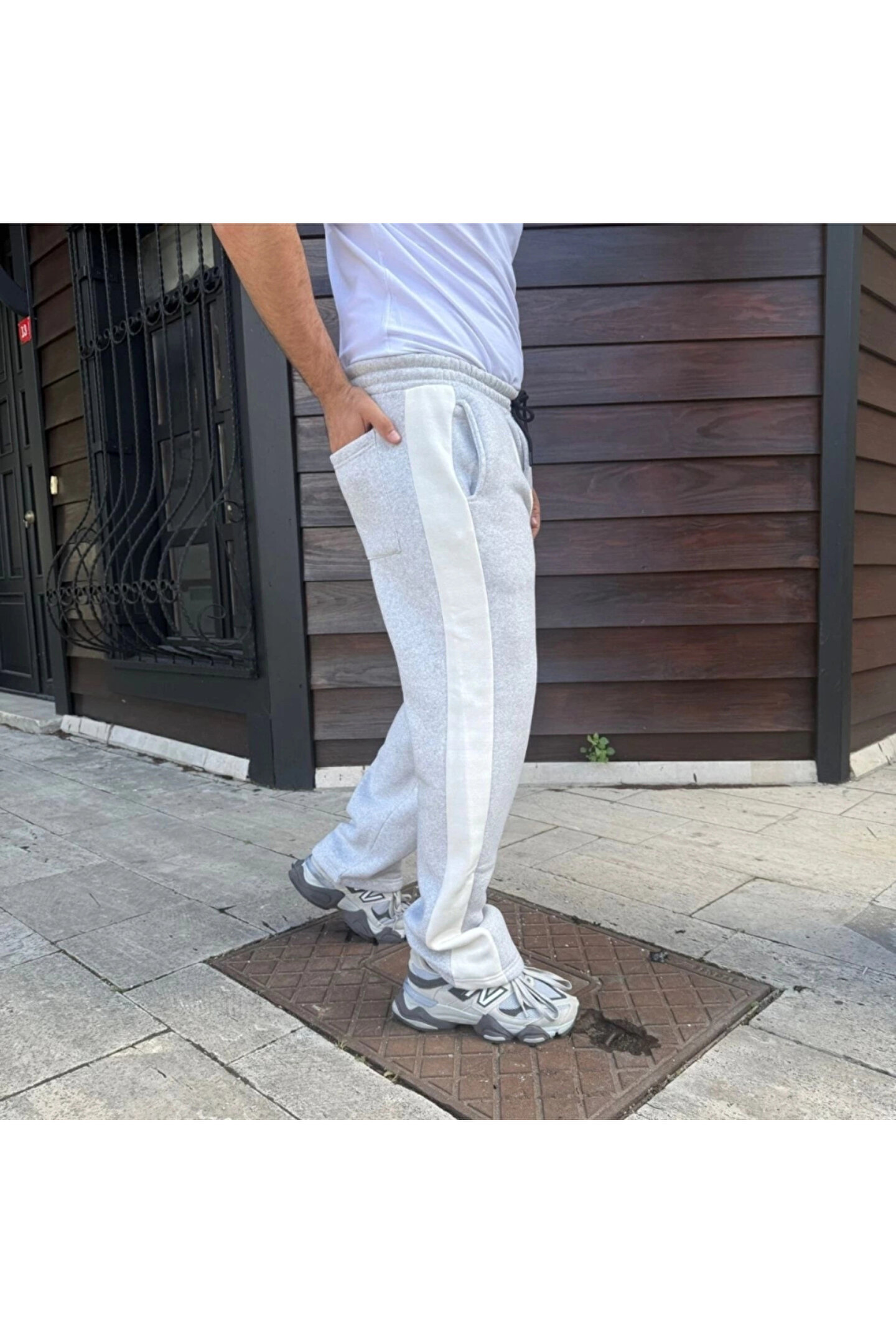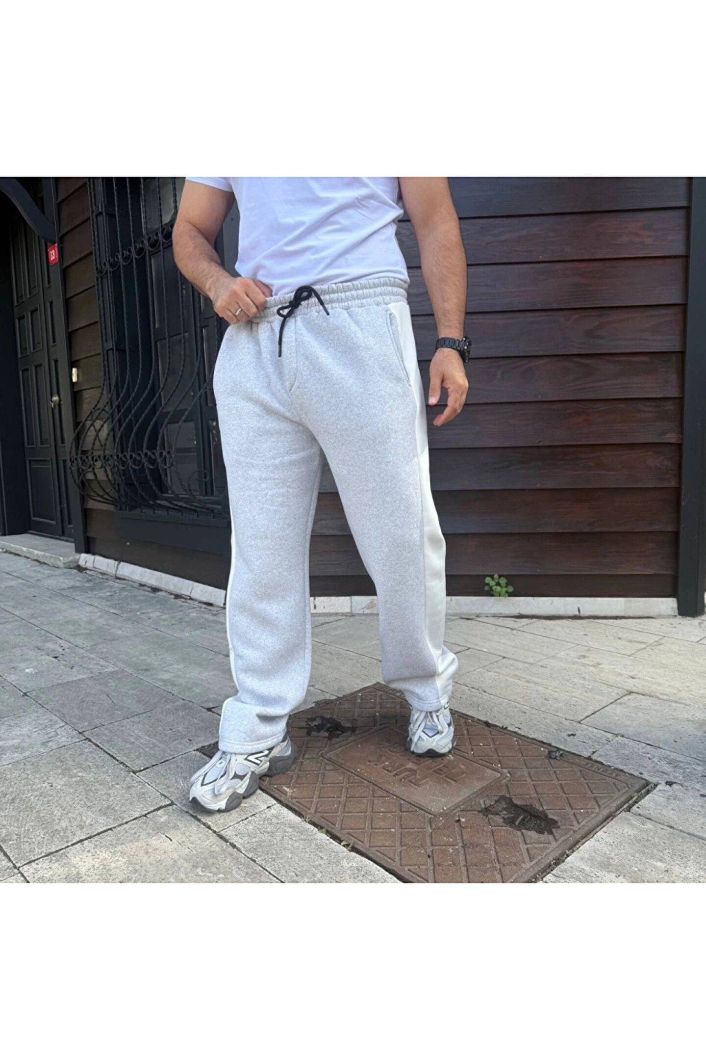 Silerra Erkek Üç İplik Kışlık Pamuklu Yandan Garneli Kalın Bej Şeritli Cepli Eşofman Altı - Gri