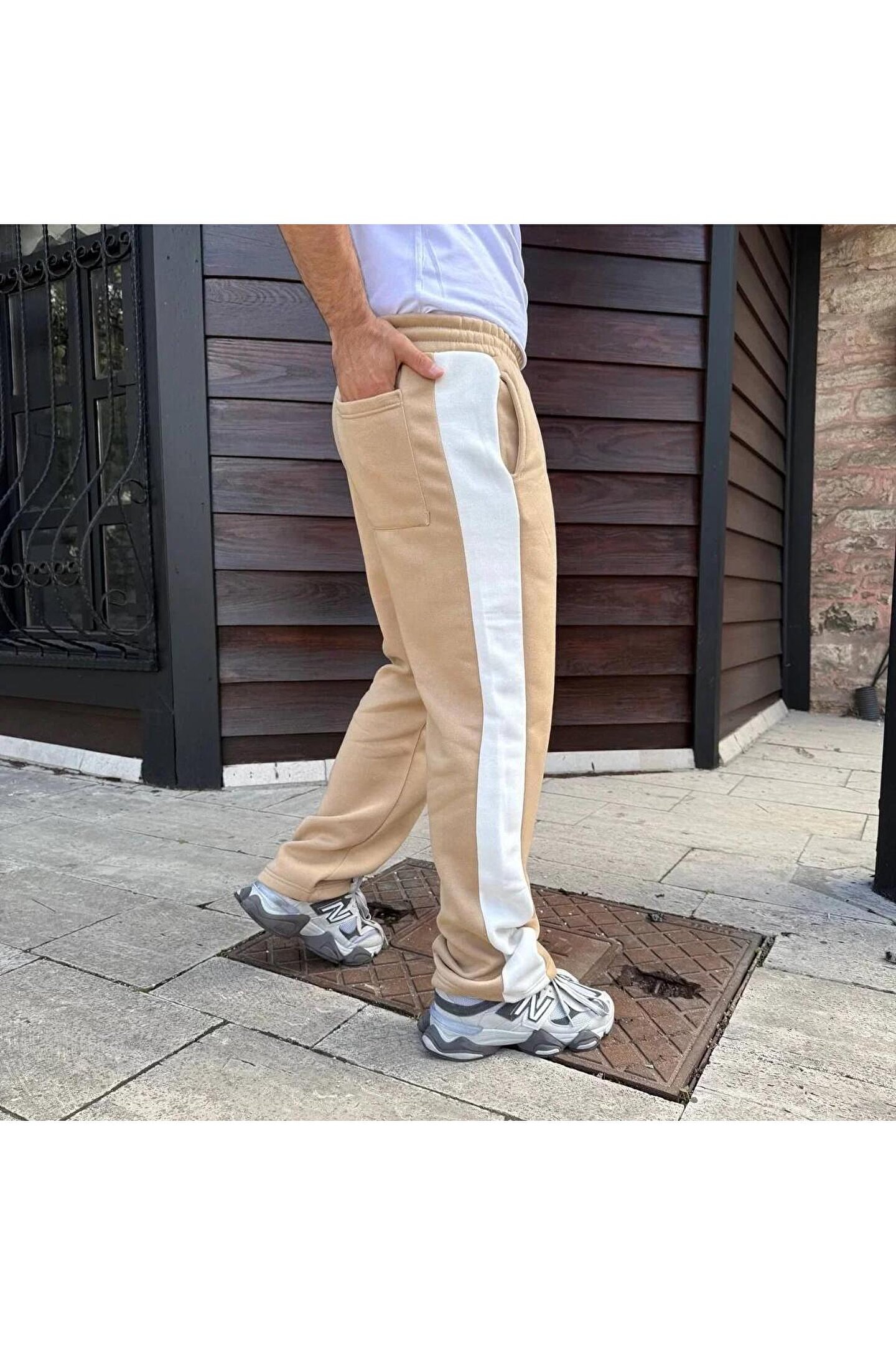 Silerra Erkek Üç İplik Kışlık Pamuklu Yandan Garneli Kalın Şeritli Cepli Eşofman Altı - Bej