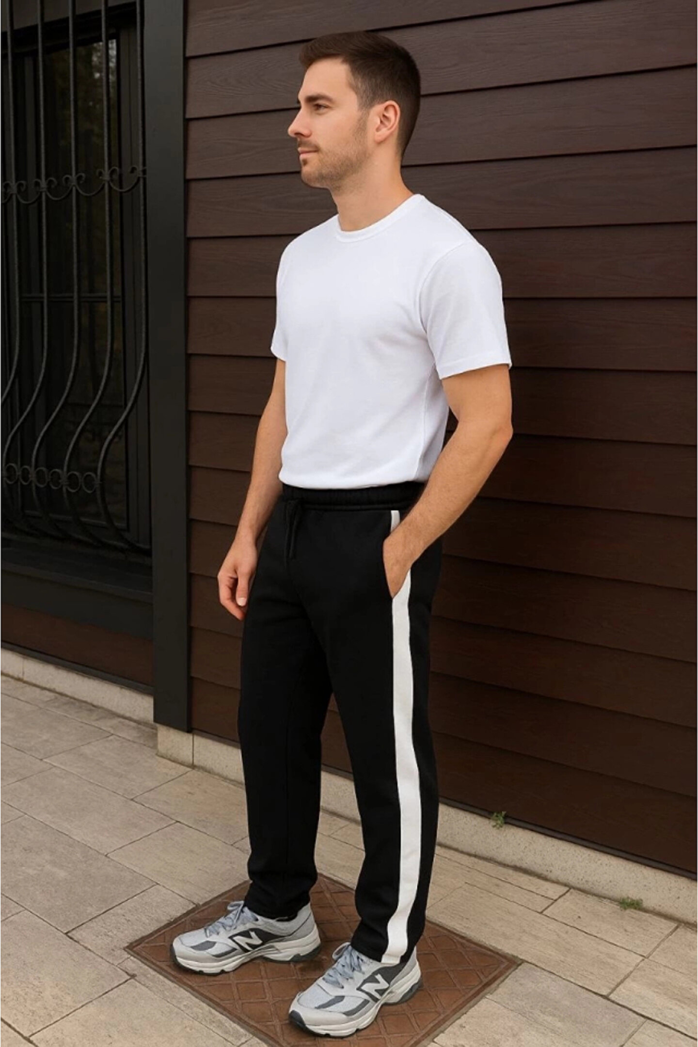 Erkek Üç İplik Kışlık Pamuklu Yandan Garneli Kalın Şeritli Cepli Eşofman Altı - Siyah