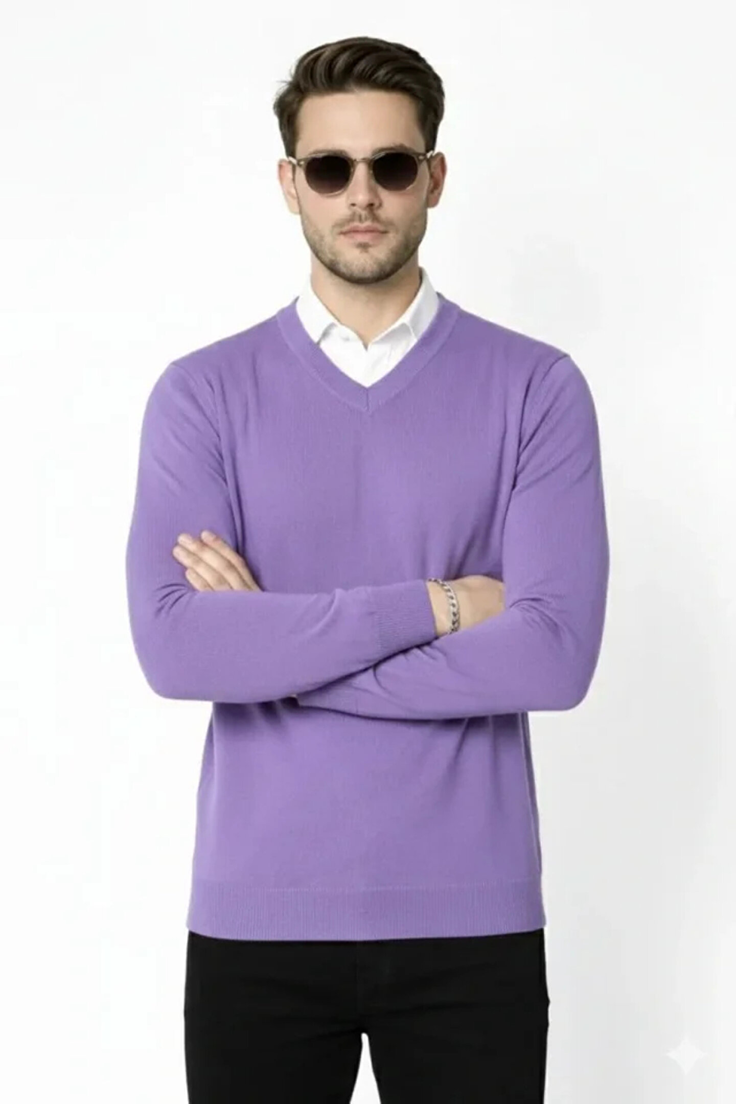 Erkek V Yaka Triko Kazak Yumuşak Dokulu Pamuklu Ince Dokuma, Uzun Kollu Rahat Regular Kalıp - Mor