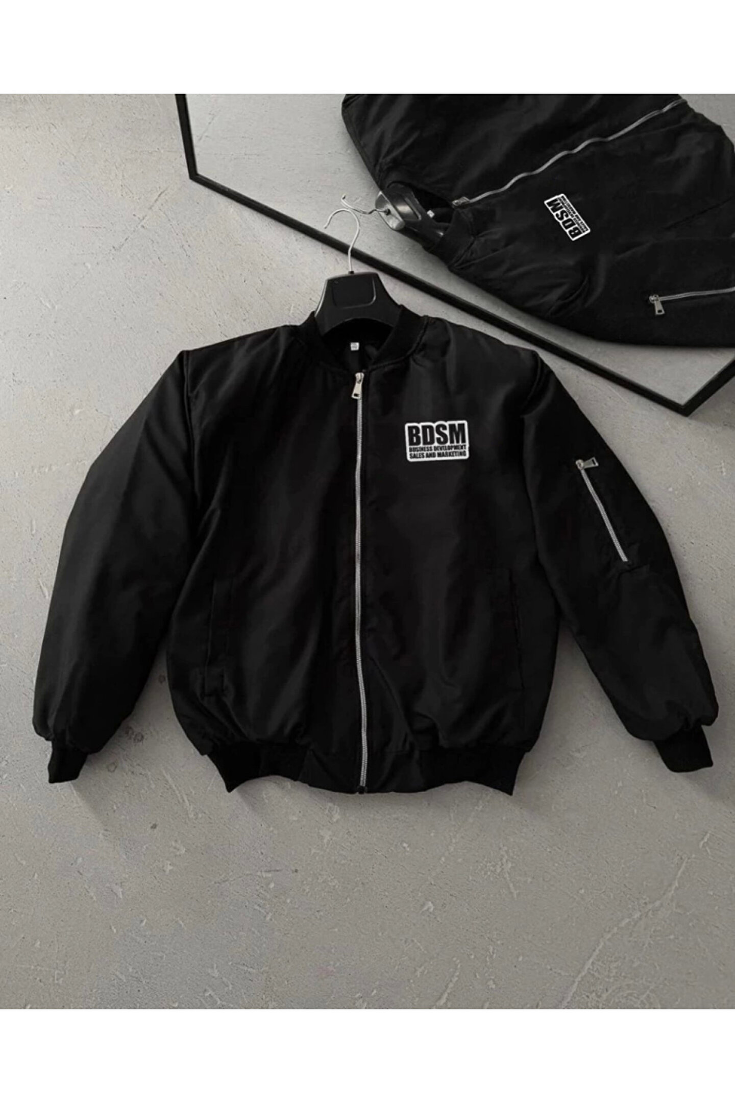 İçi Kapitone Astarlı Tam Kalıp Baskılı Bomber Ceket - Siyah