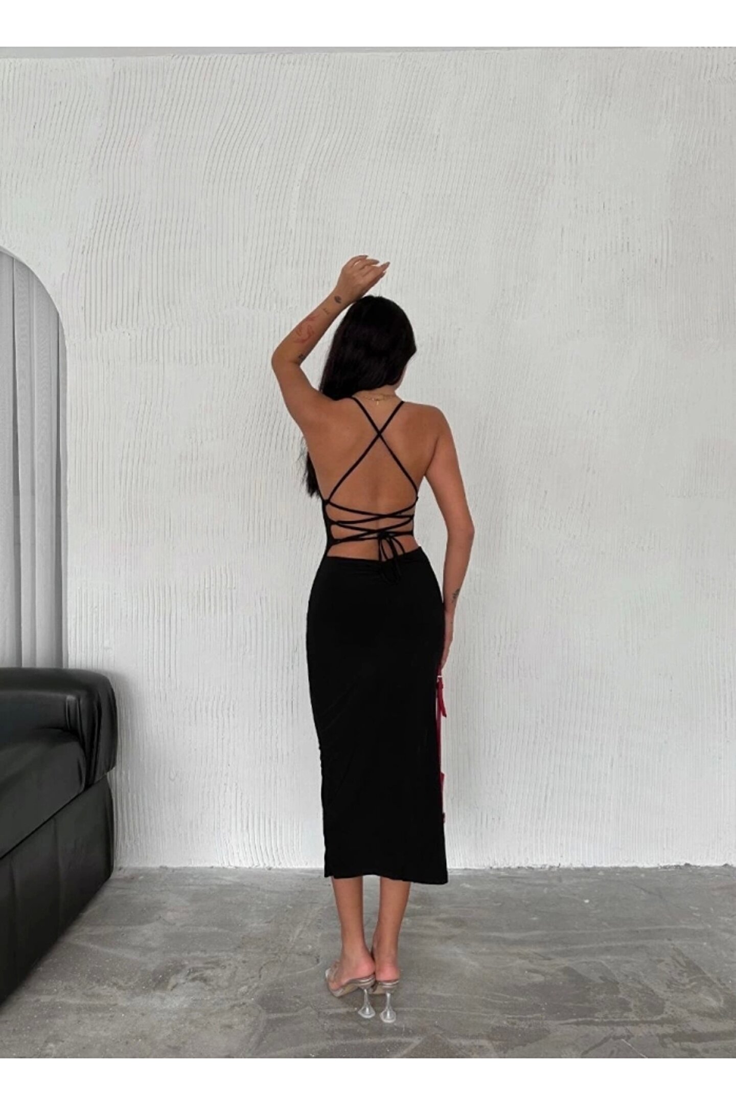 Silerra ırt Bağlamalı Derin Yirtmaç Askılı Elbise iyah