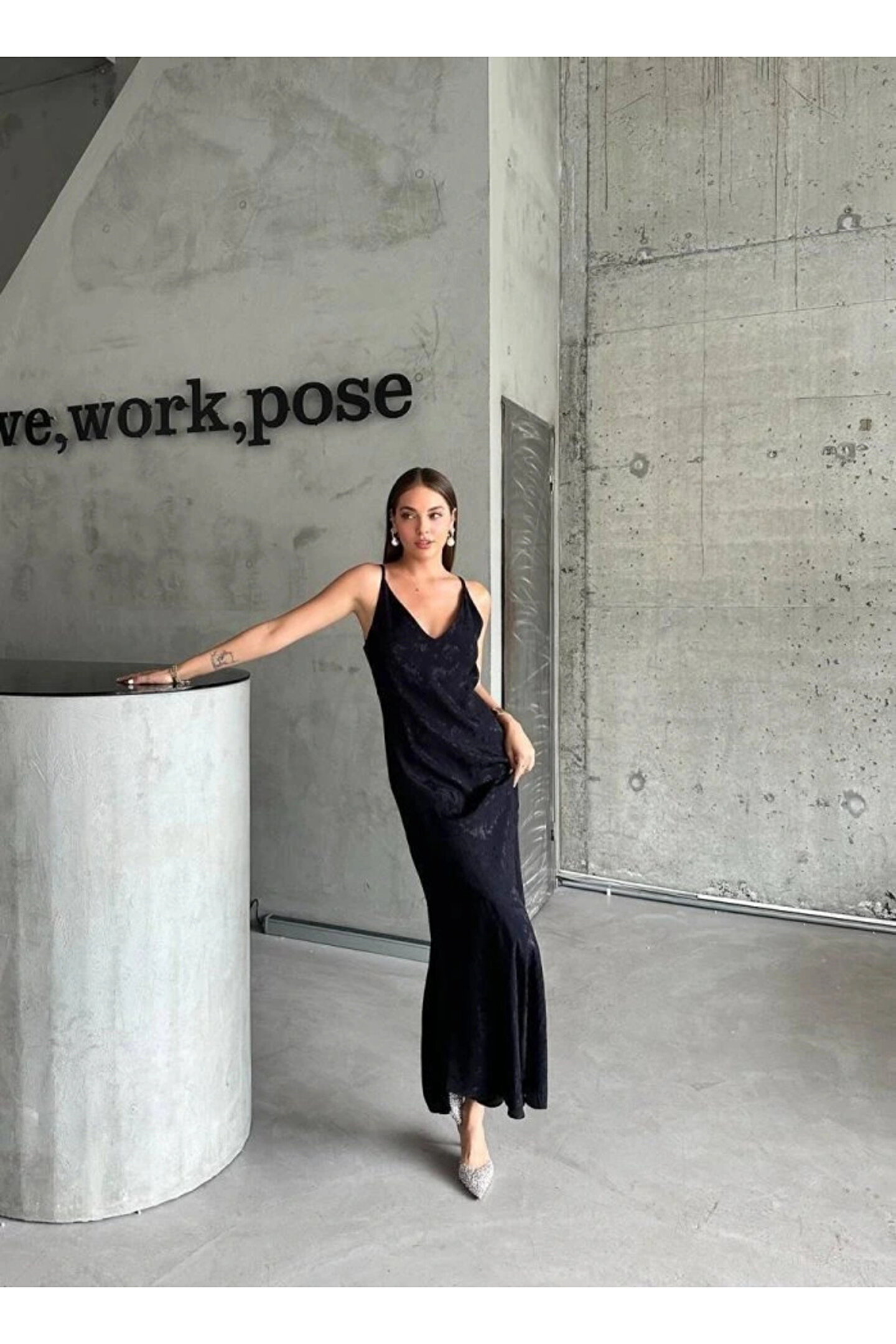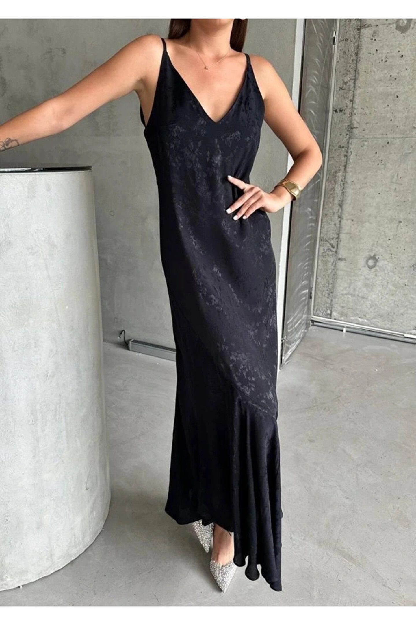 JAKARLI ASKILI SATEN ELBİSE ASİMETRİK - Siyah
