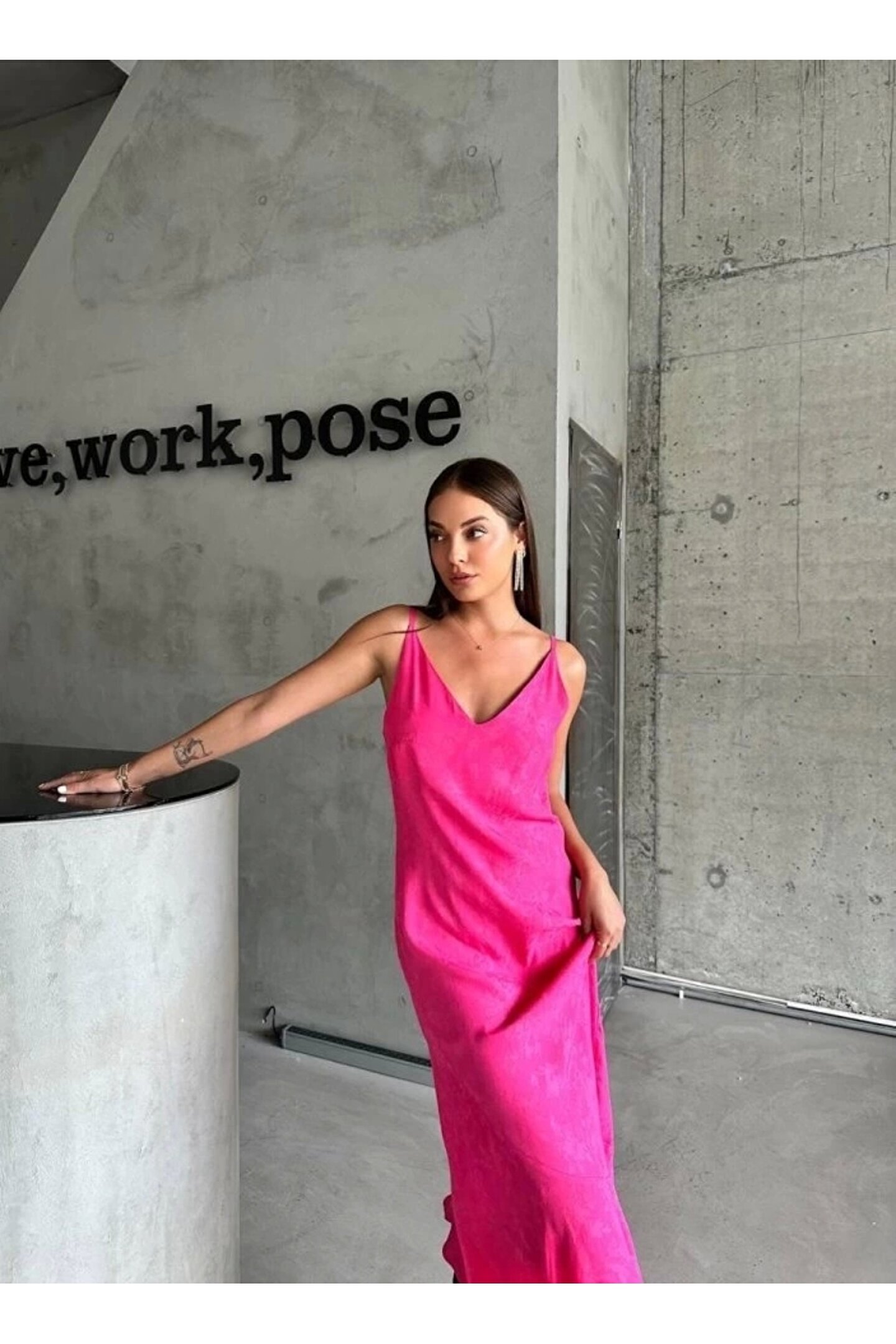 JAKARLI ASKILI SATEN ELBİSE ASİMETRİK - Pembe