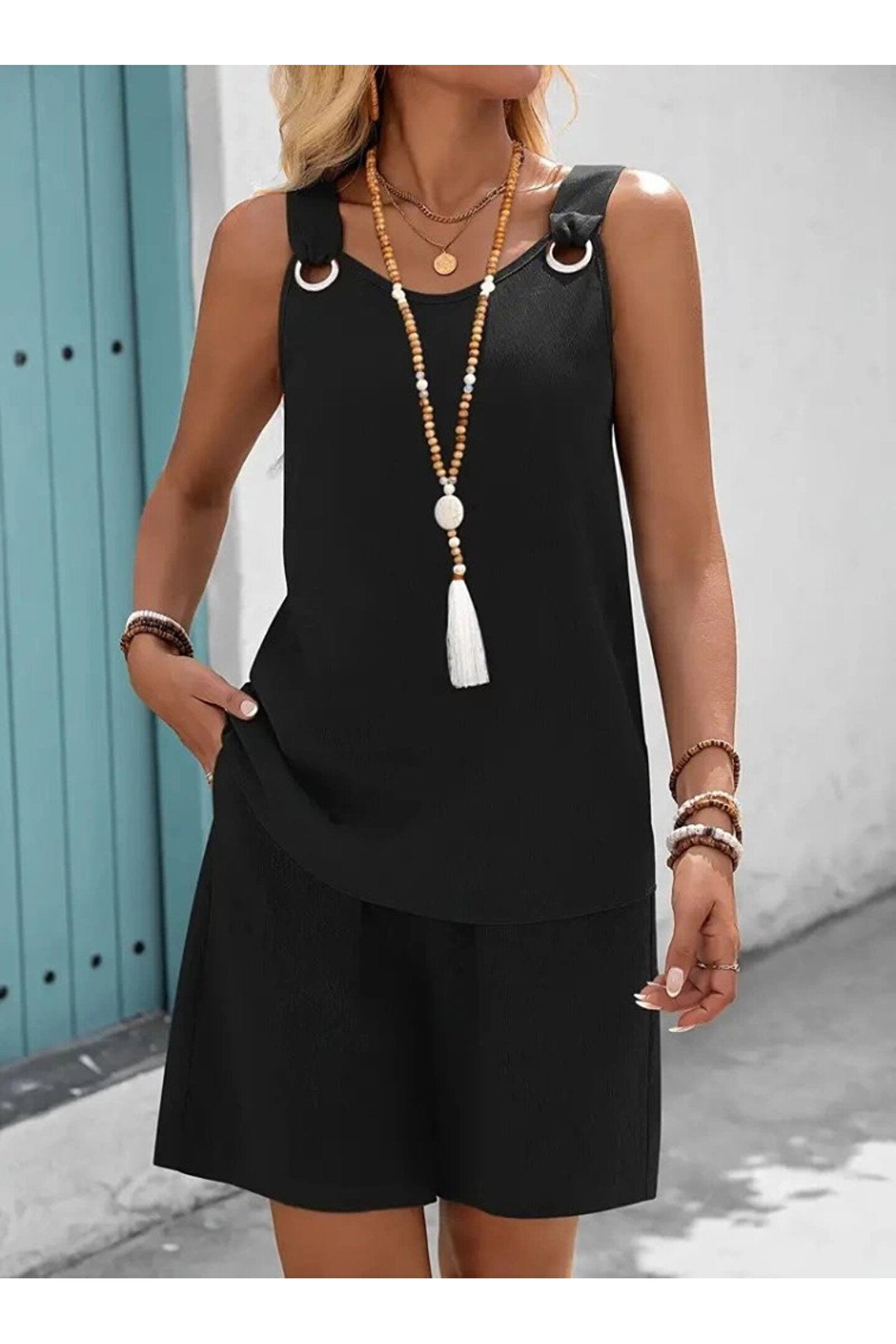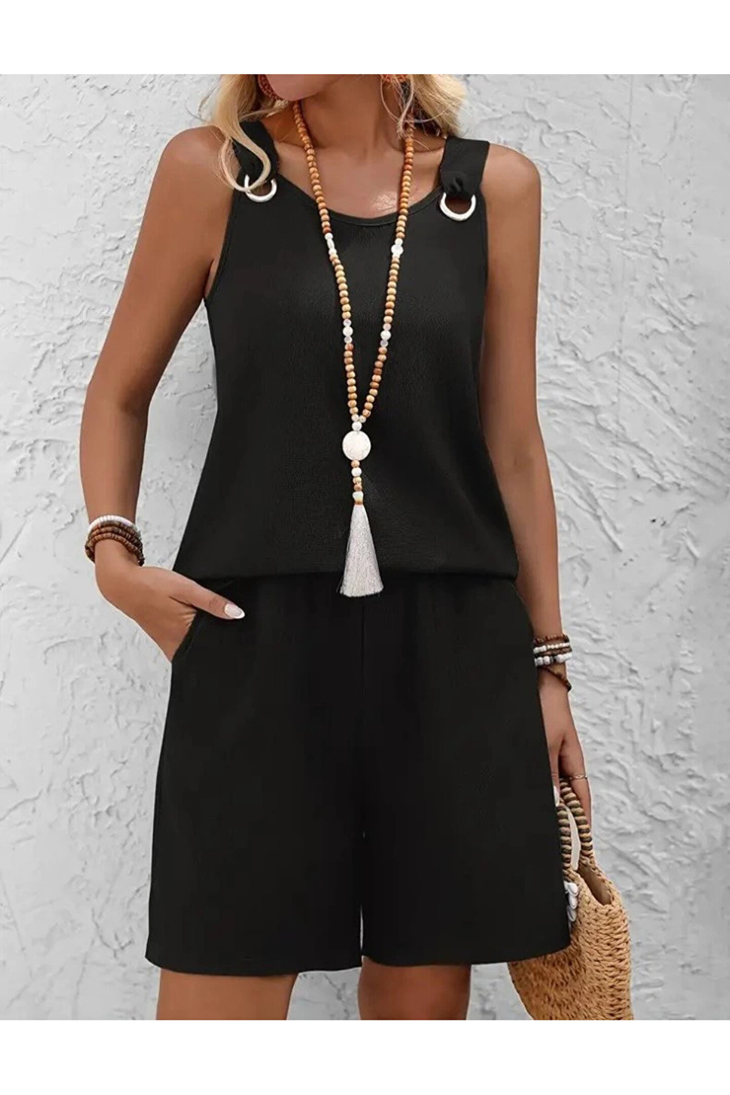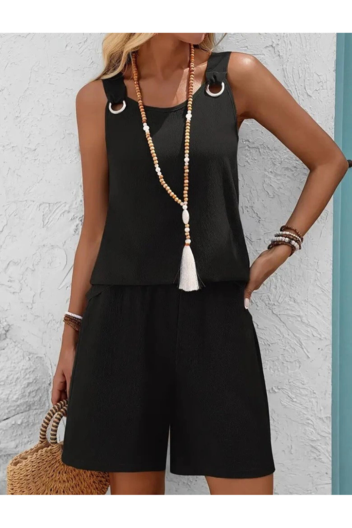 Silerra Kadın Askılı Yuvarlak Yaka Kuş Gözü Detaylı Bürümcük Bluz Ve Short Ikili Takım