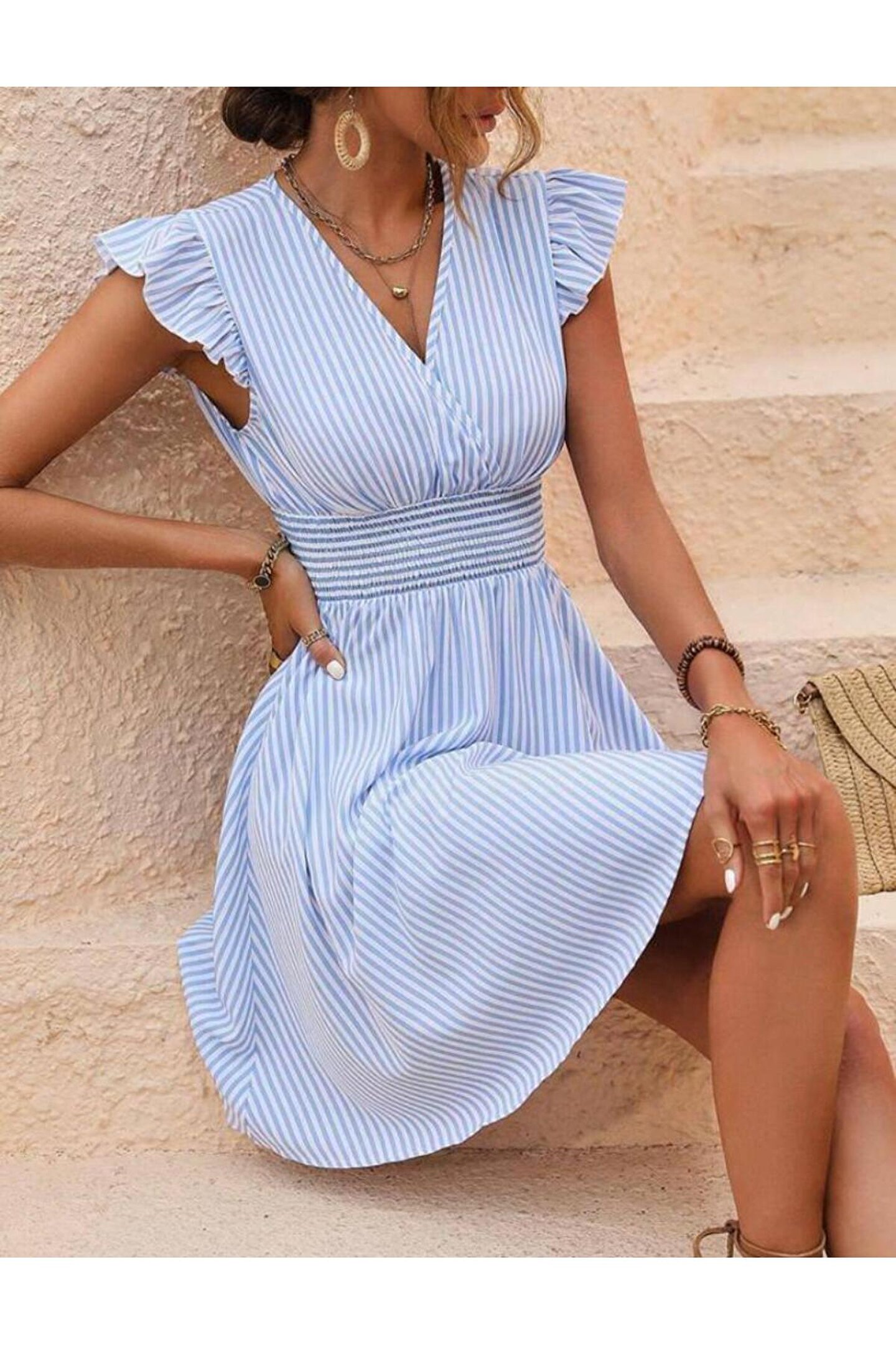 Kadın Beli Gipeli Omuz Detaylı Pamuk-Polyester Kumaş Elbise Modelin Ölçüleri: Boy:165, Kg:55, Göğüs:90, Bel:72, Kalça: 100 Modelin üzerindeki ürün M/38 bedendir TARZ-Kokteyl; YAKA-V Yaka; DESEN-Çizgili; UZUNLUK-Diz Üstü;