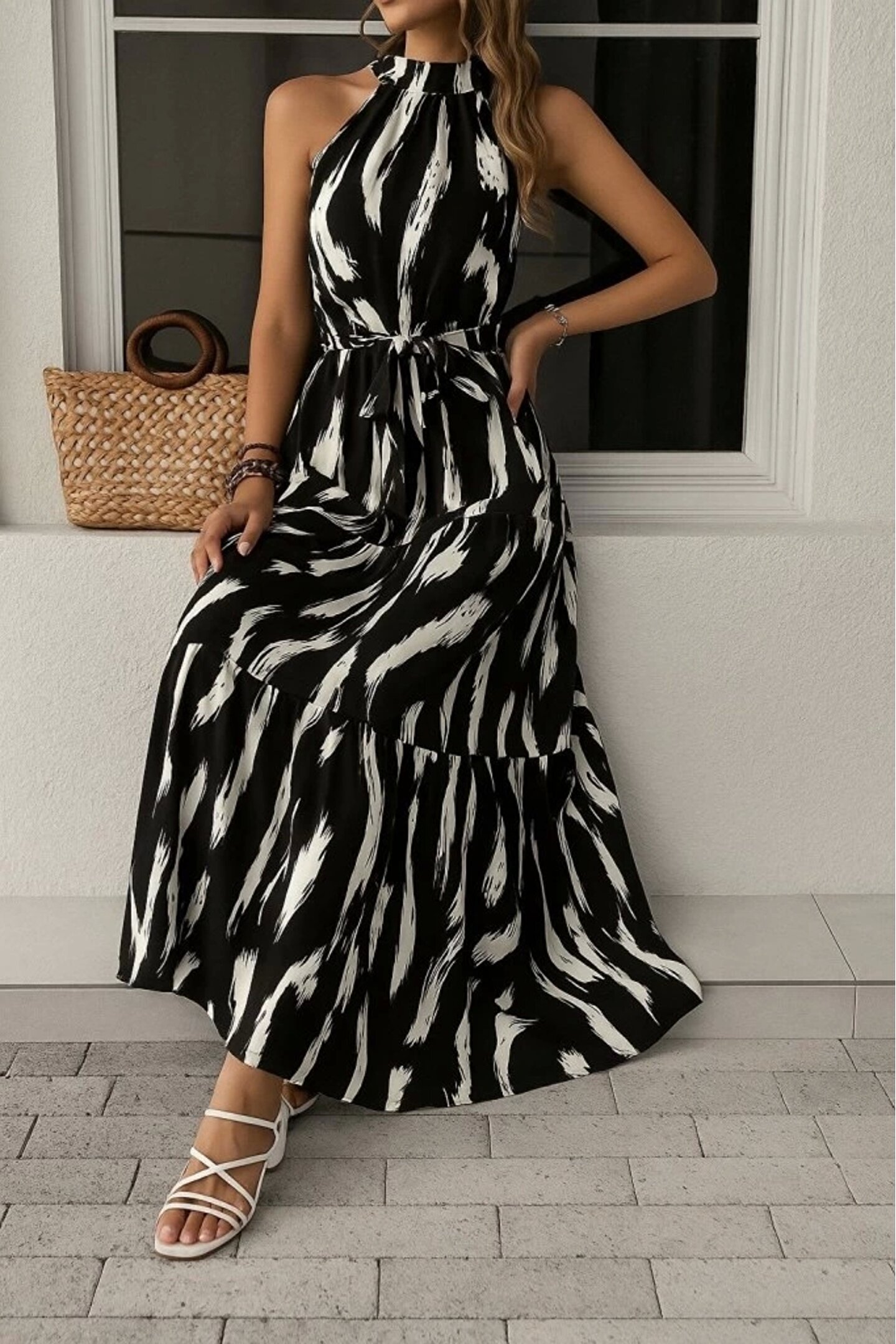 Kadın Halter Yakalı Omuzlardan Açık Kuşaklı Maksi Boy Desenli Süprem Elbise