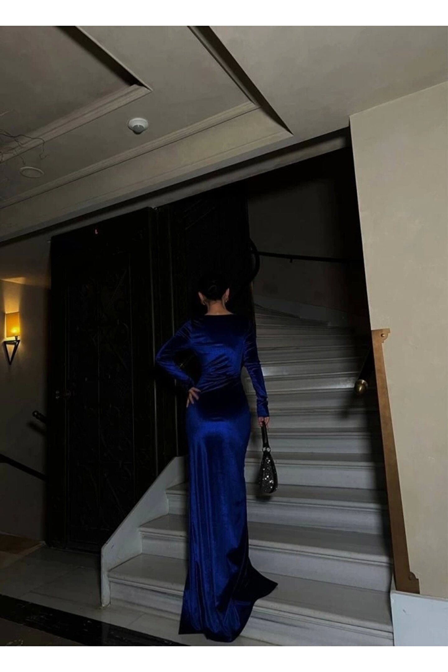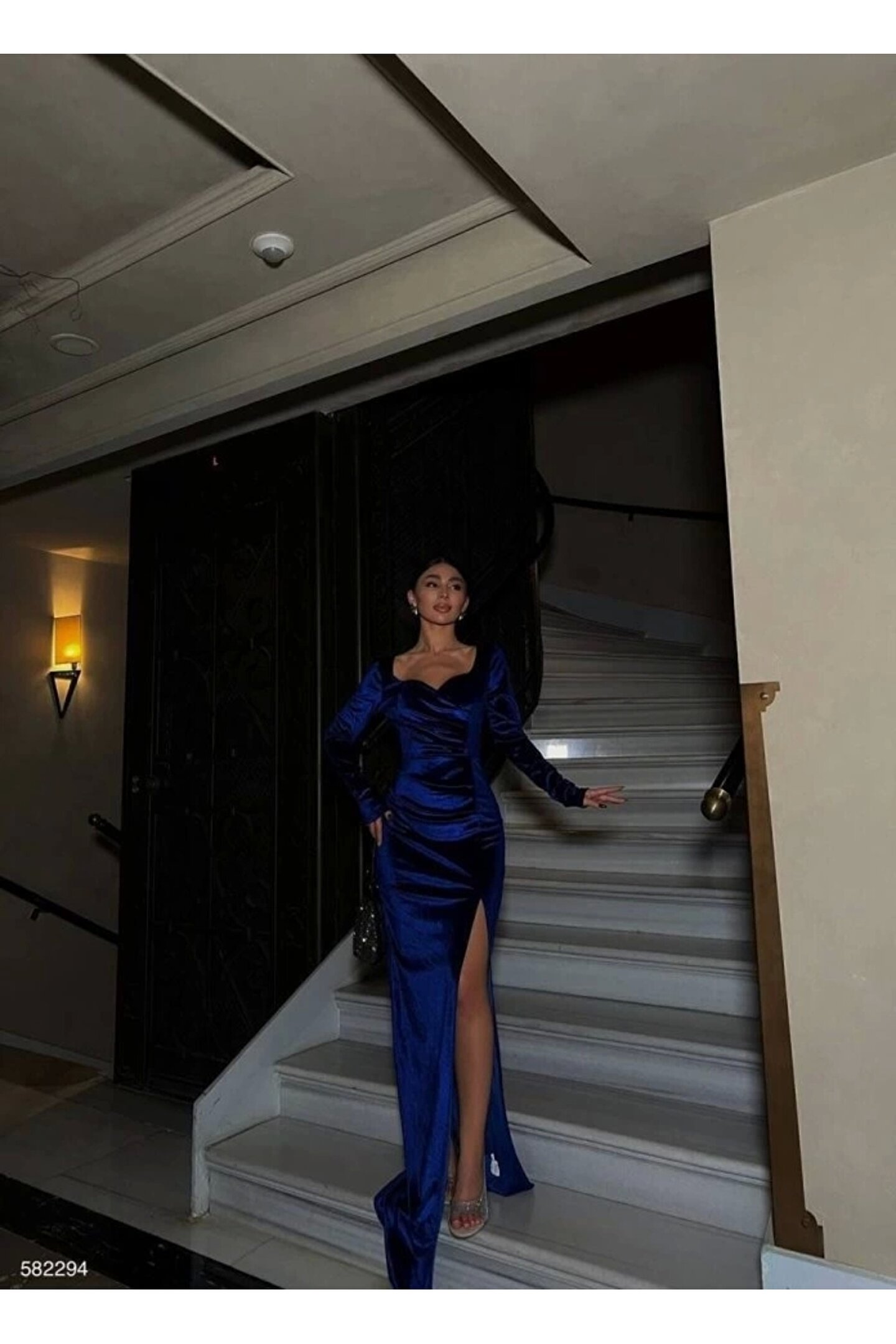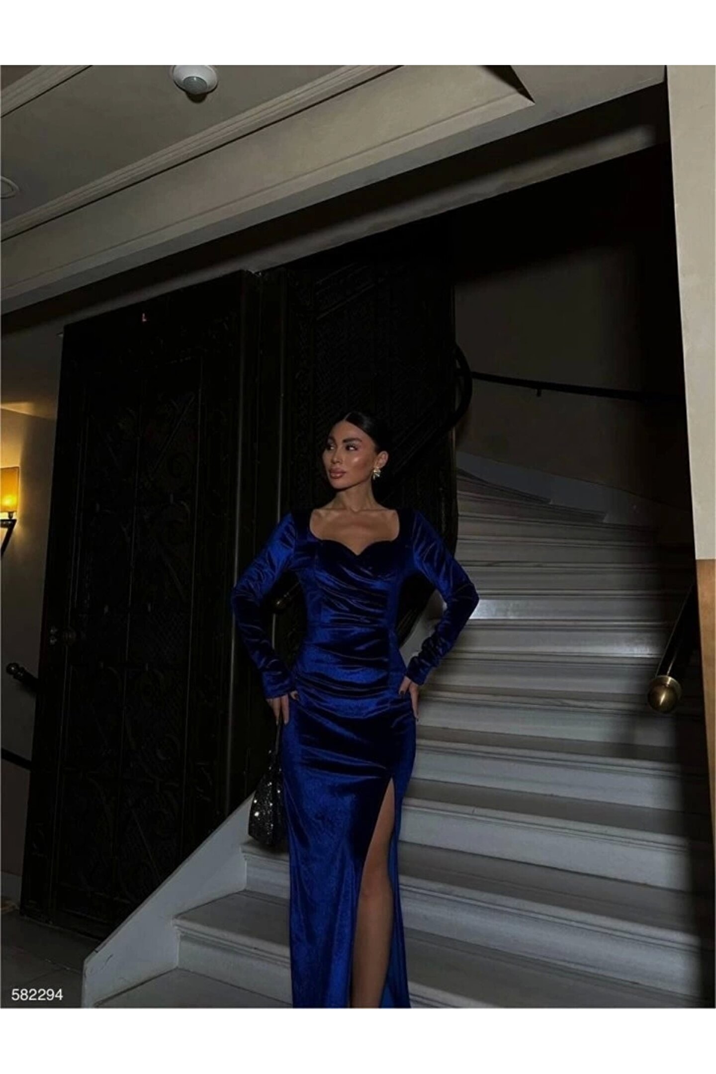 Kadın Kadife Kumaş Kalp Yaka Yırtmaç Detaylı Maxi Boy Elbise