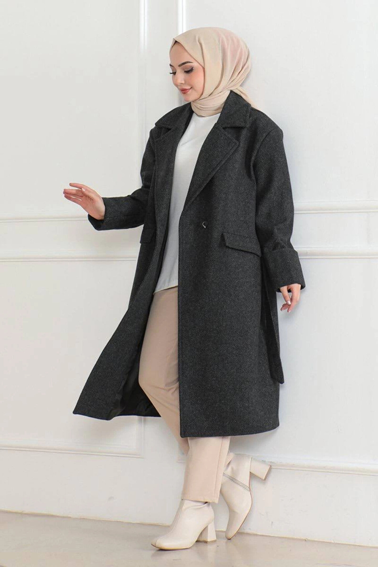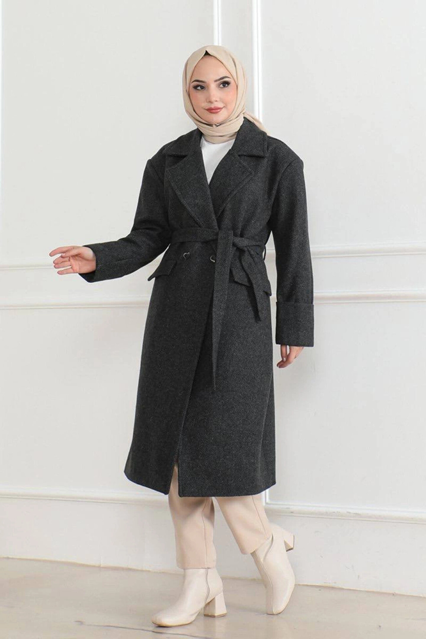Silerra Kadın Kaşe Kaban – Uzun Boy 115 cm Kruvaze Yaka Kuşaklı Astarlı Kışlık Tesettür Kaban, Yünlü Dokuma