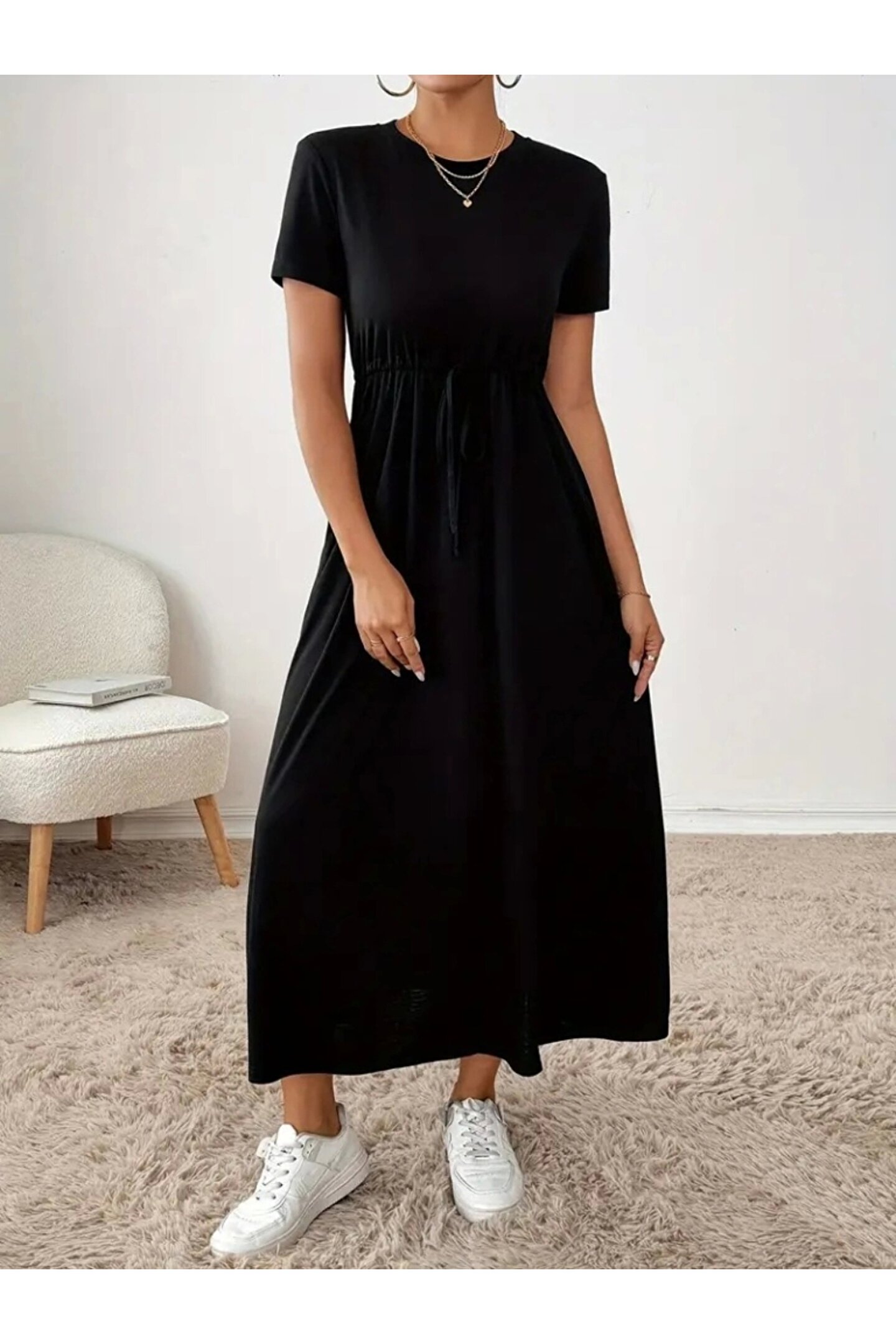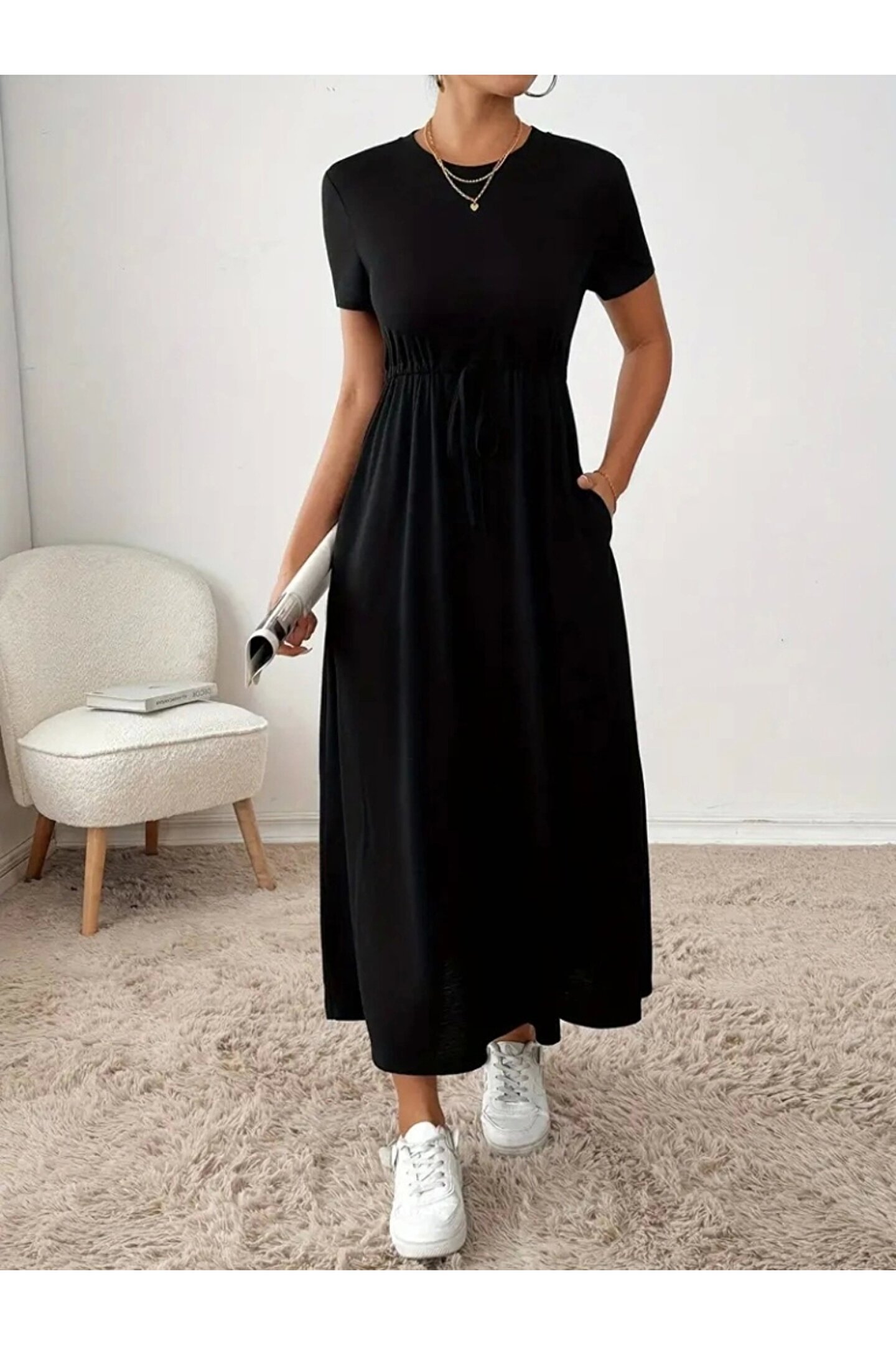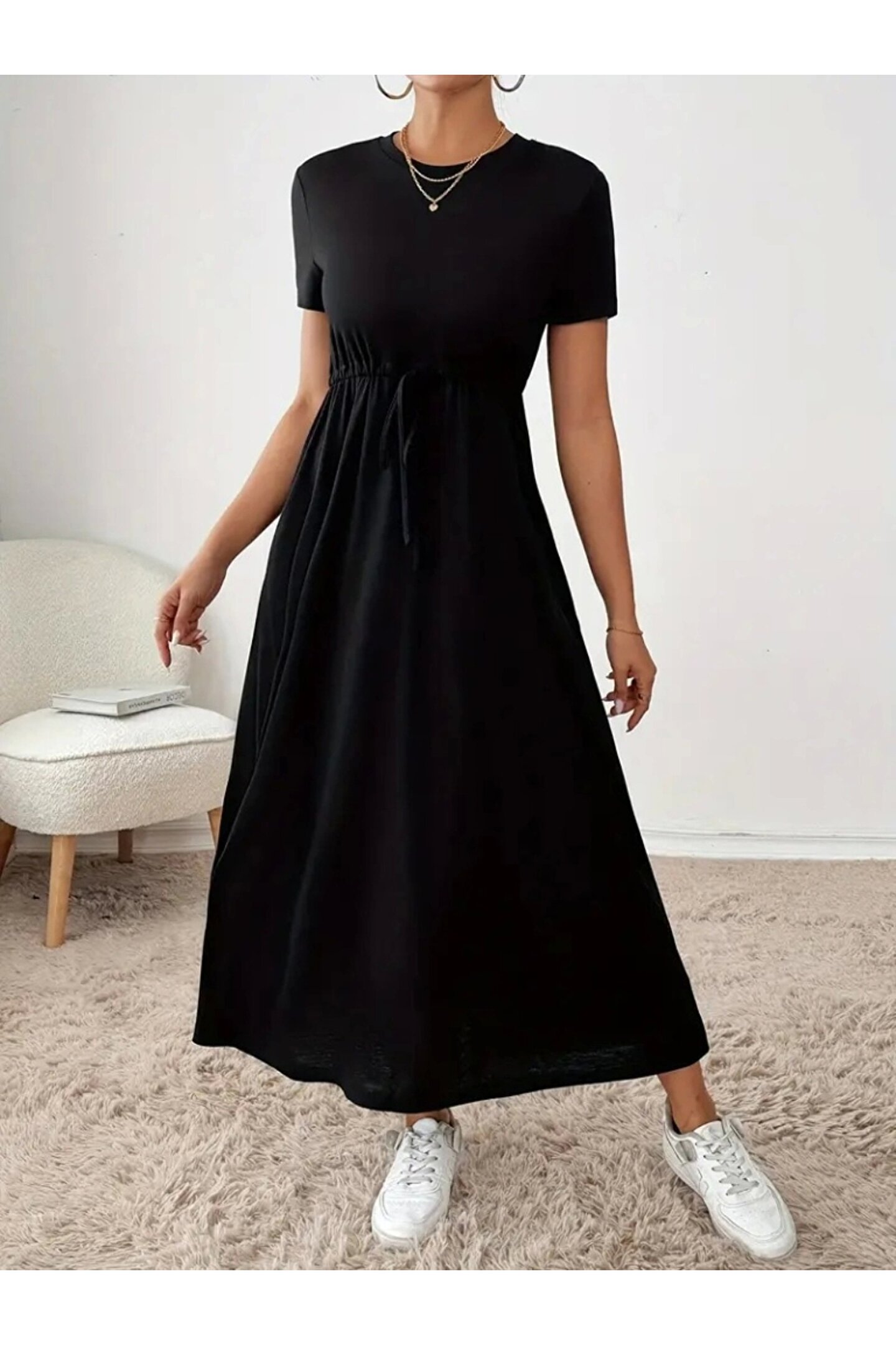 Kadın Kısa Kollu Bisiklet Yaka Belden Bağcıklı Cepli Viskon Elbise