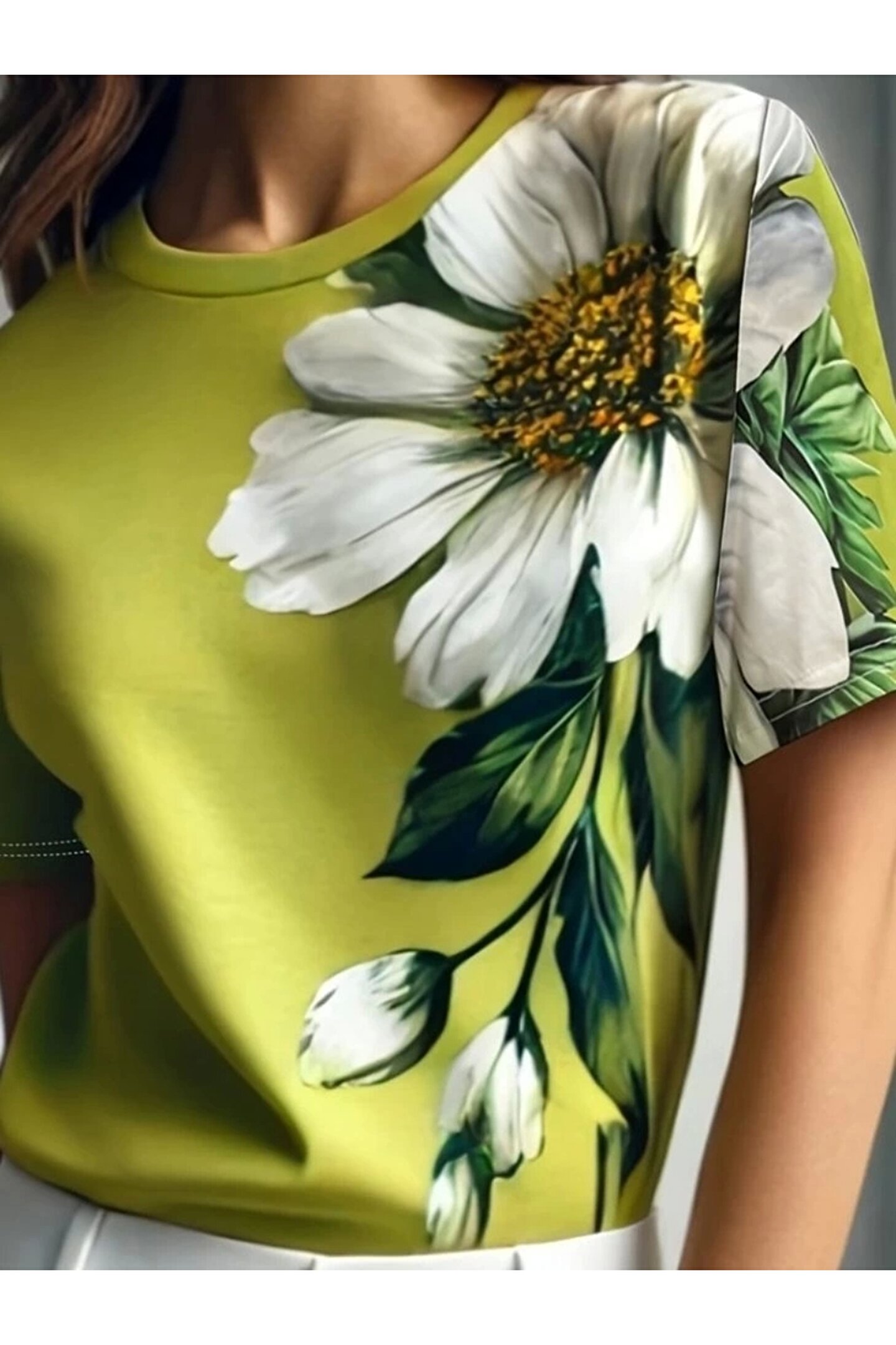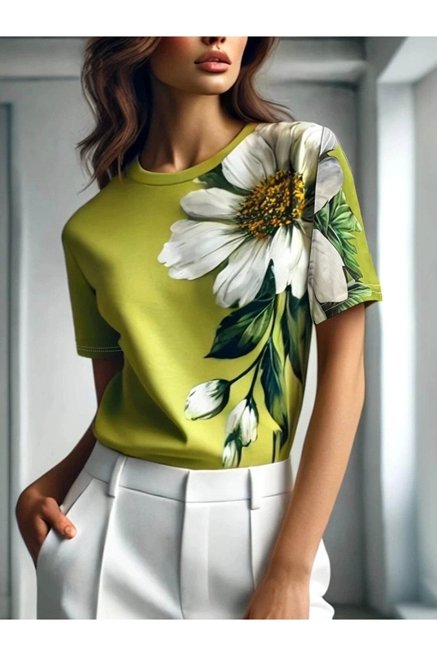 Kadın Kısa Kollu Bisiklet Yaka çiçek Baskılı Süprem Bluz