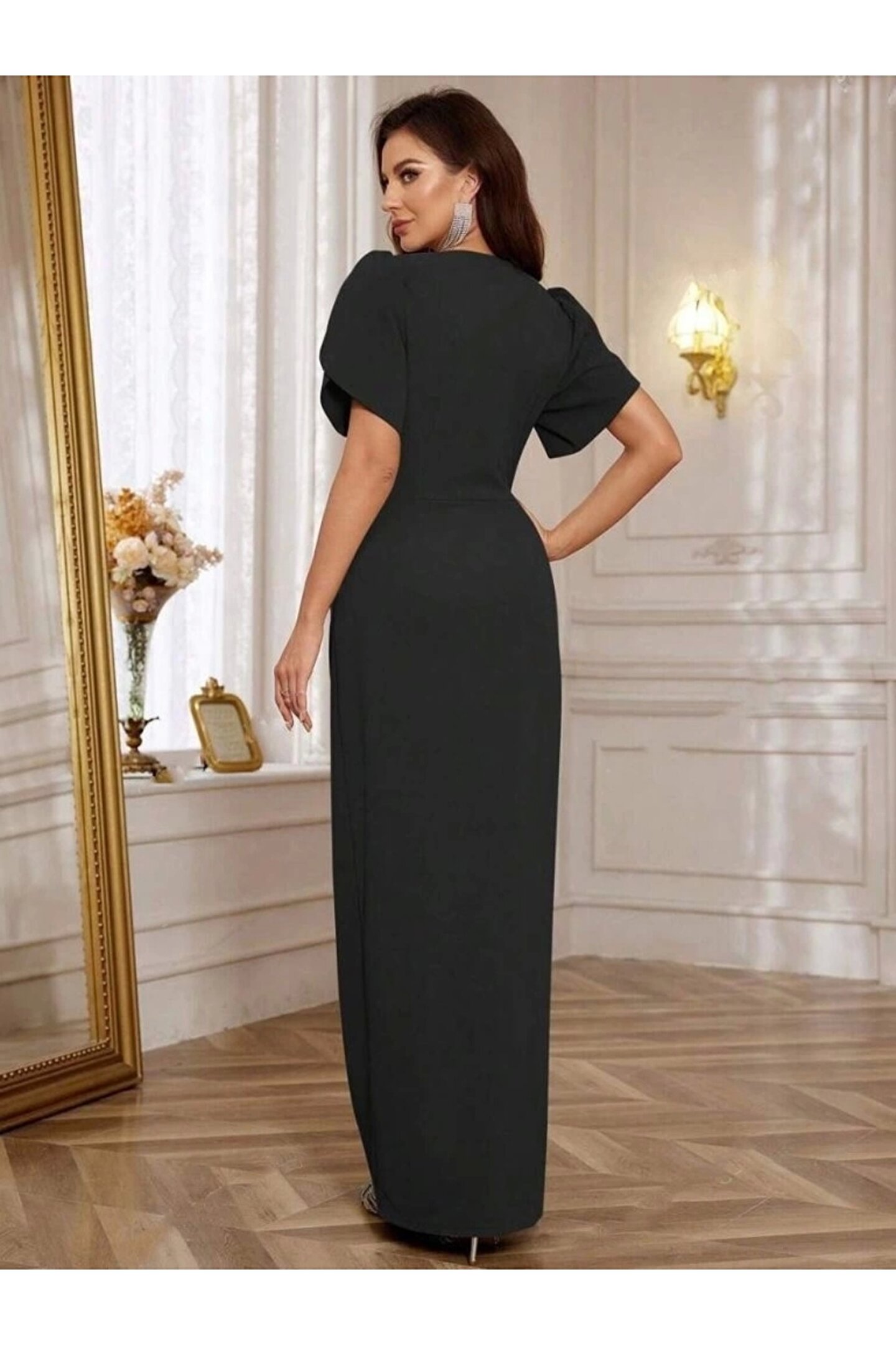 Kadın Kısa Kollu Kruvaze Yakalı Belden çiçek Aksesuarlı Yırtmaçlı Ithal Krep Elbise