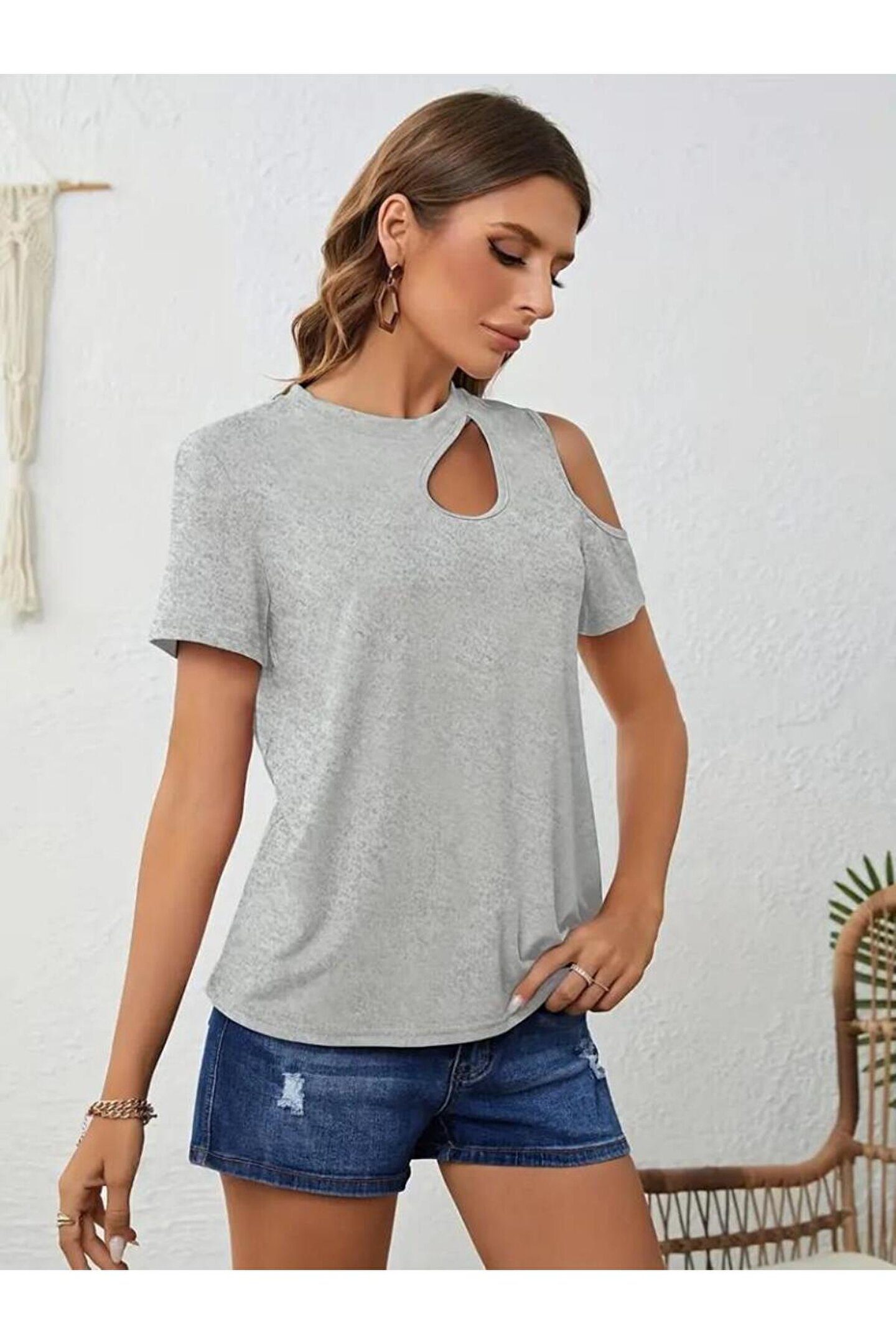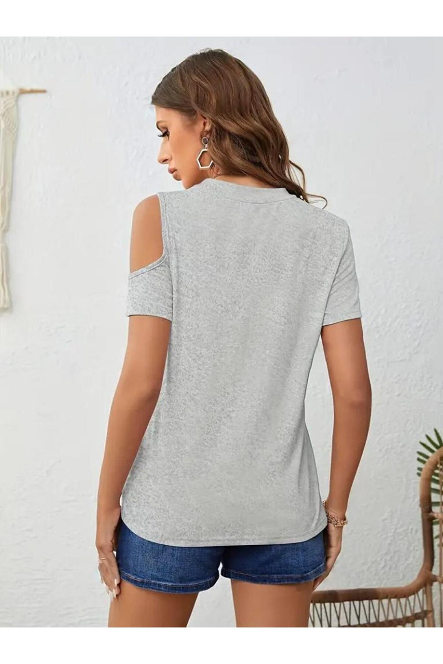 Kadın Kısa Kollu Tek Omuzu Açık Damla Detaylı Viskon Bluz