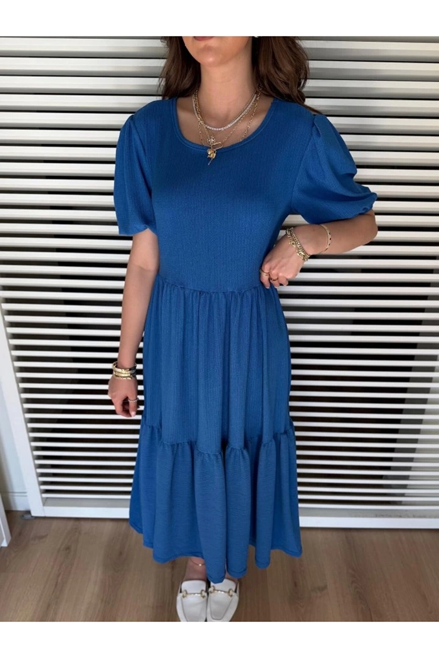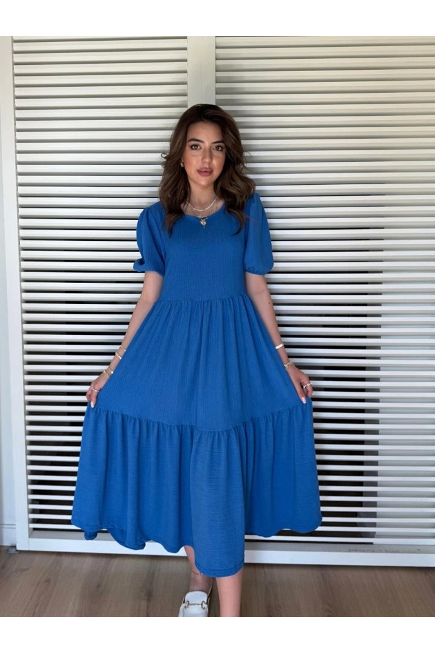 Kadın Kısa Kollu Yakası Açık Katlı Bürümcük Balon Elbise