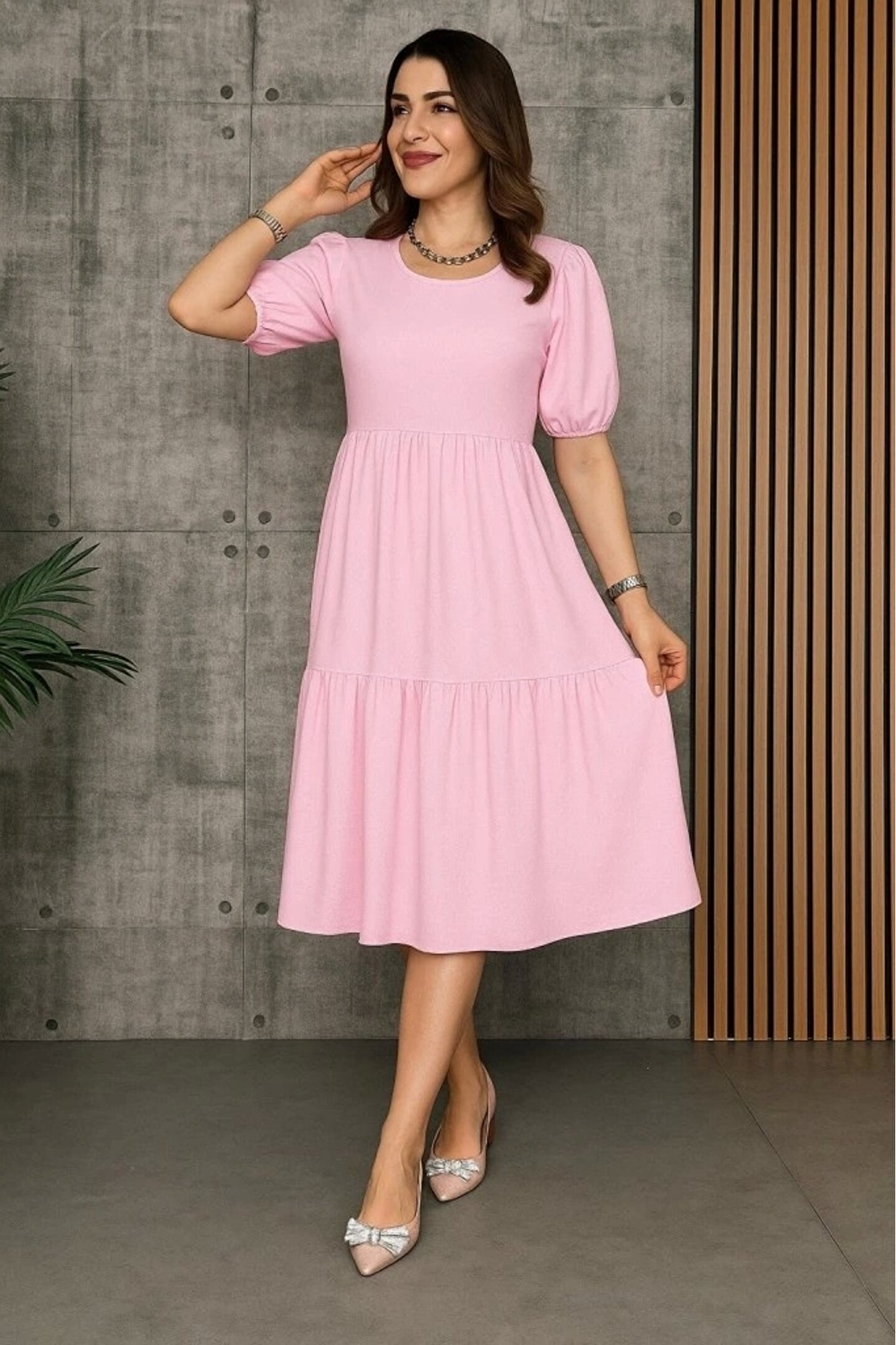 Kadın Kısa Kollu Yakası Açık Katlı Bürümcük Balon Elbise