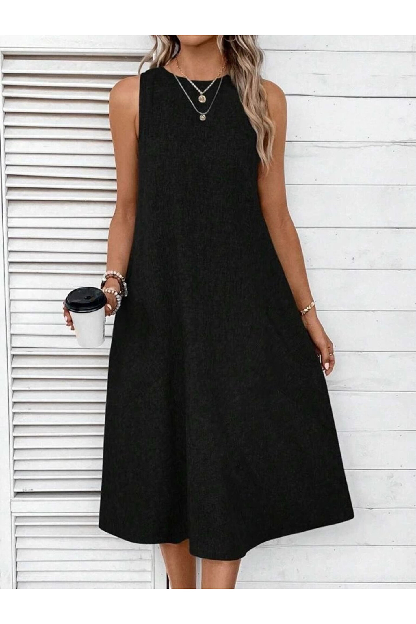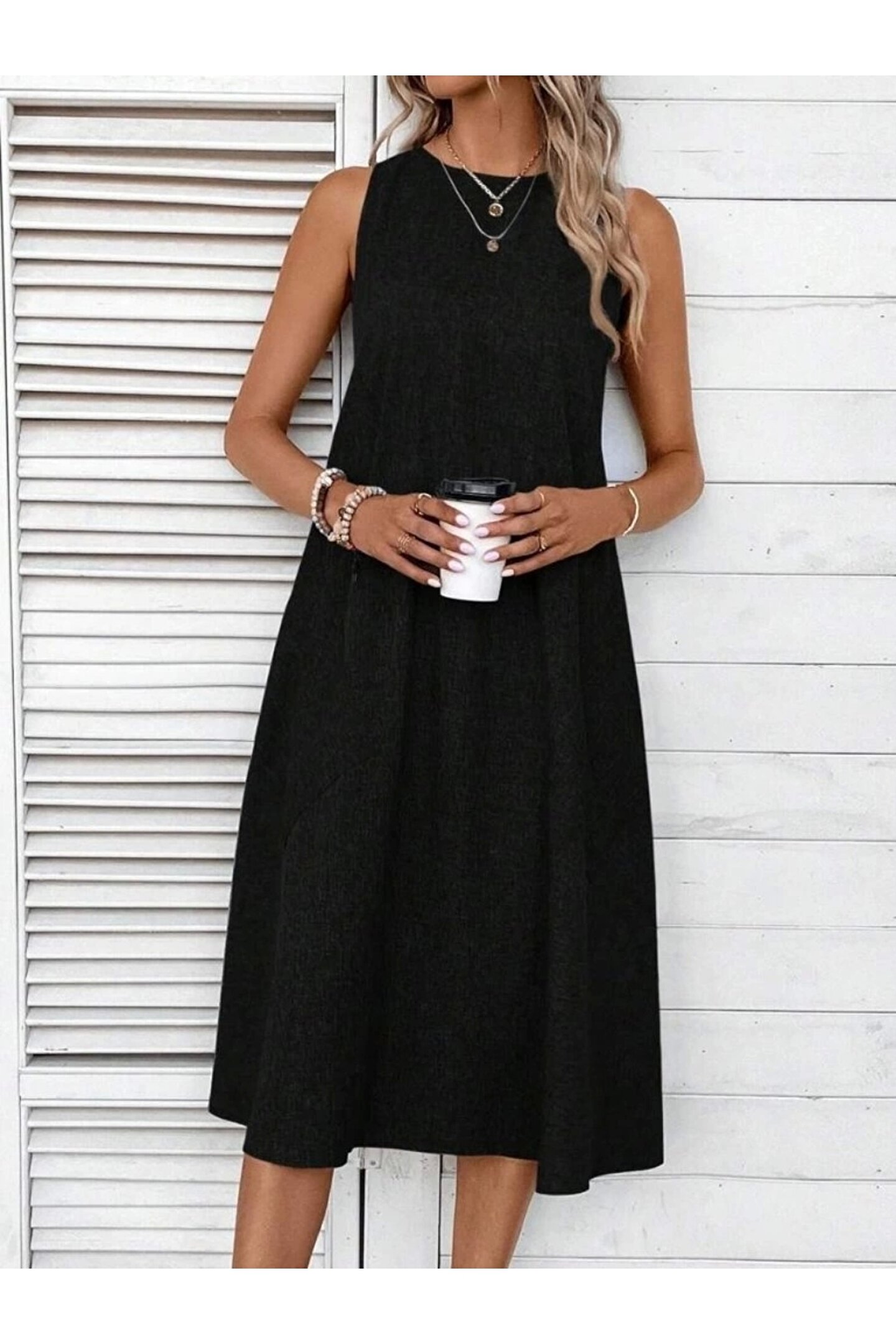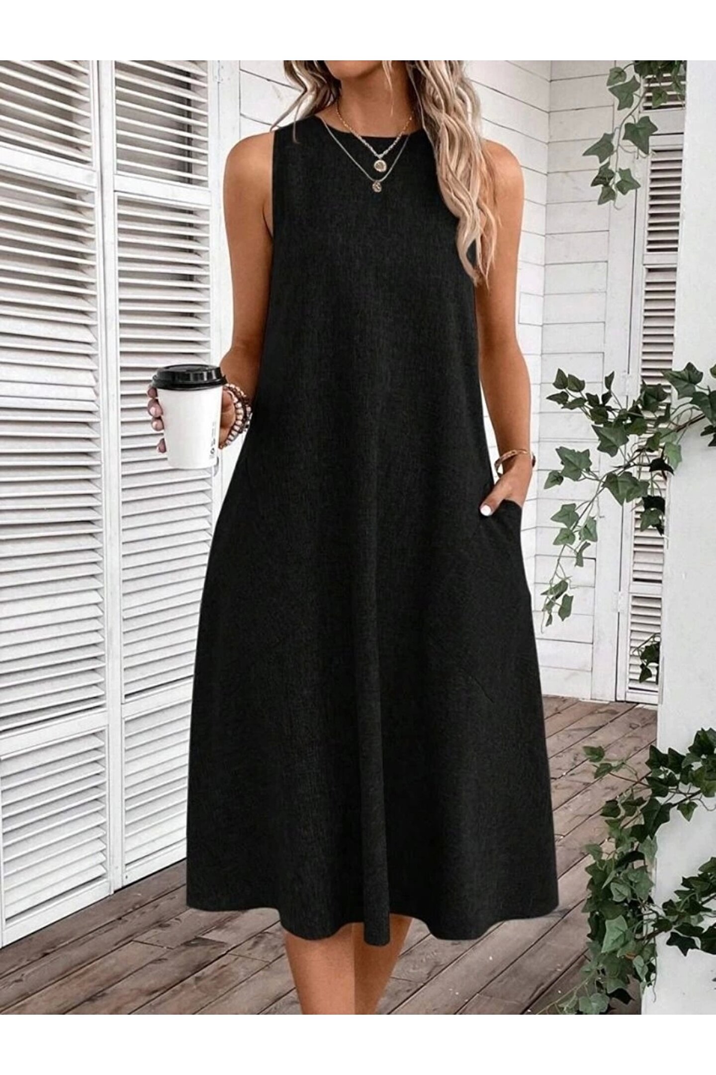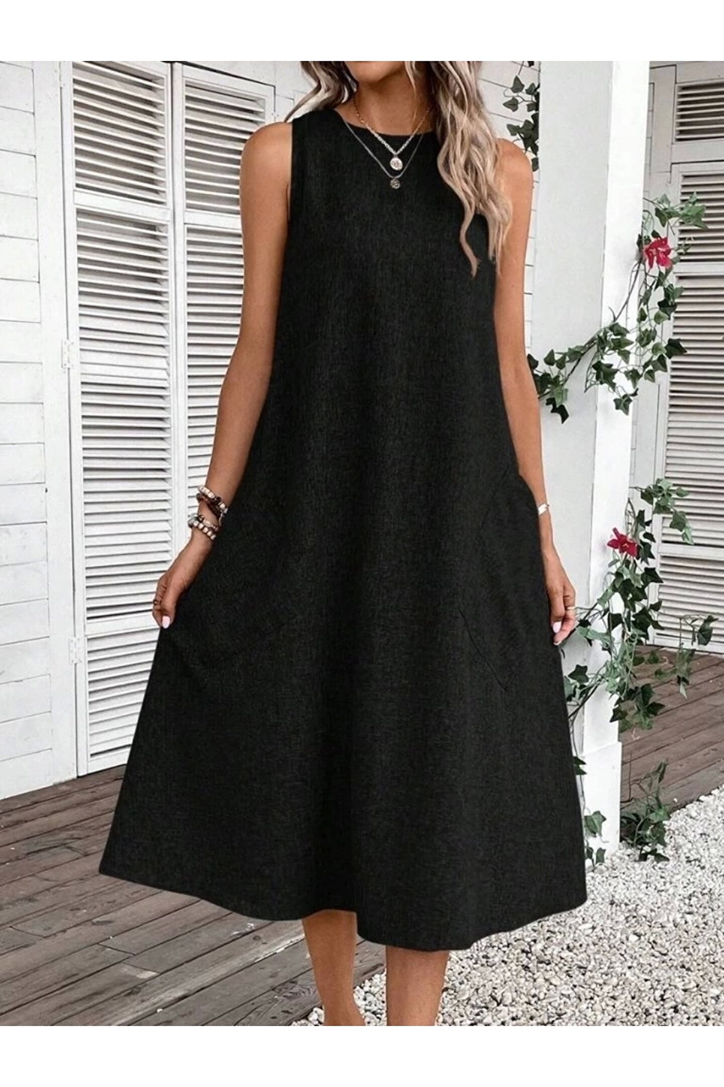 Kadın Kolsuz Bisiklet Yaka Cepli Midi Keten Elbise