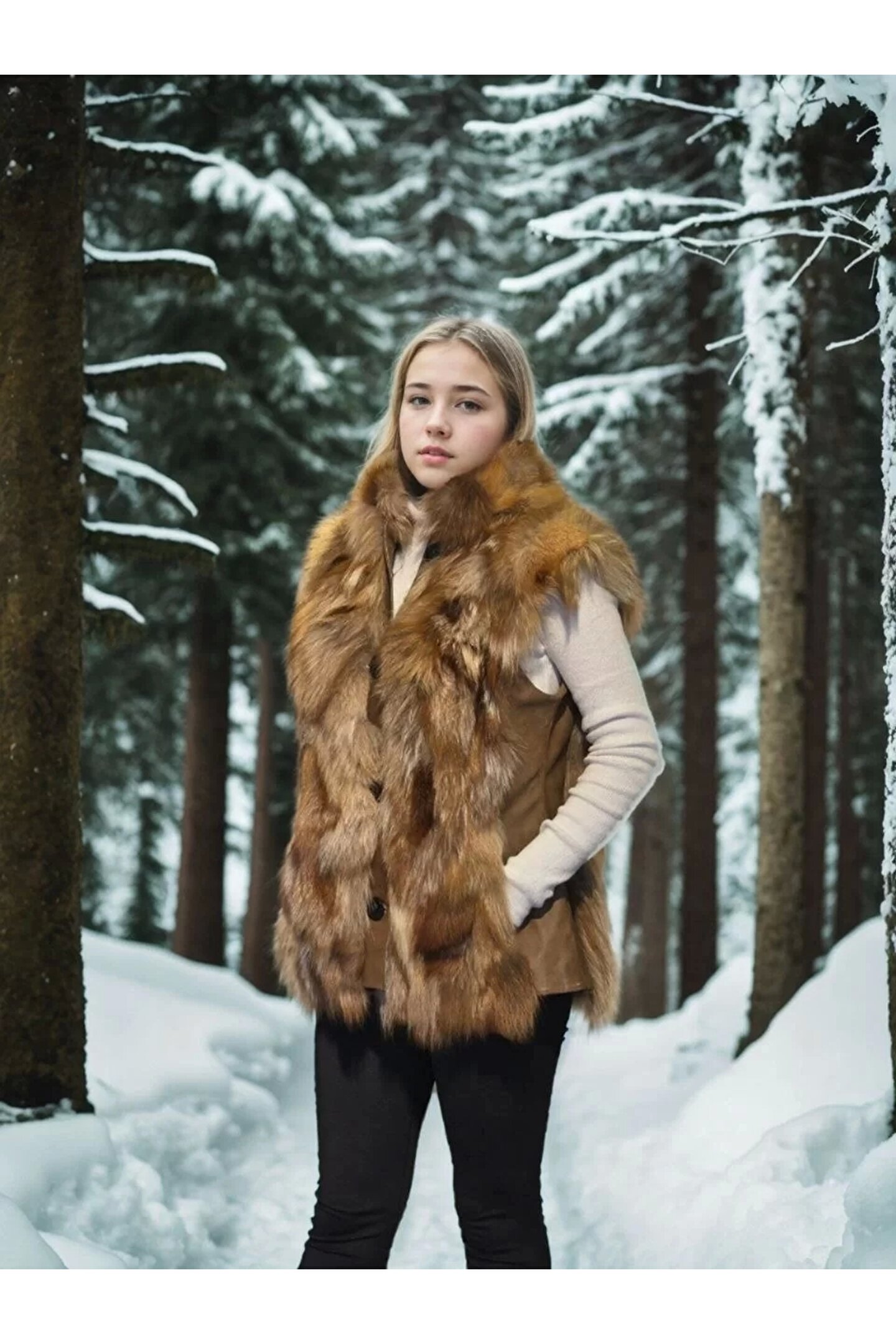 Kadın Kolsuz Hakiki Deri Kürk - Kahve