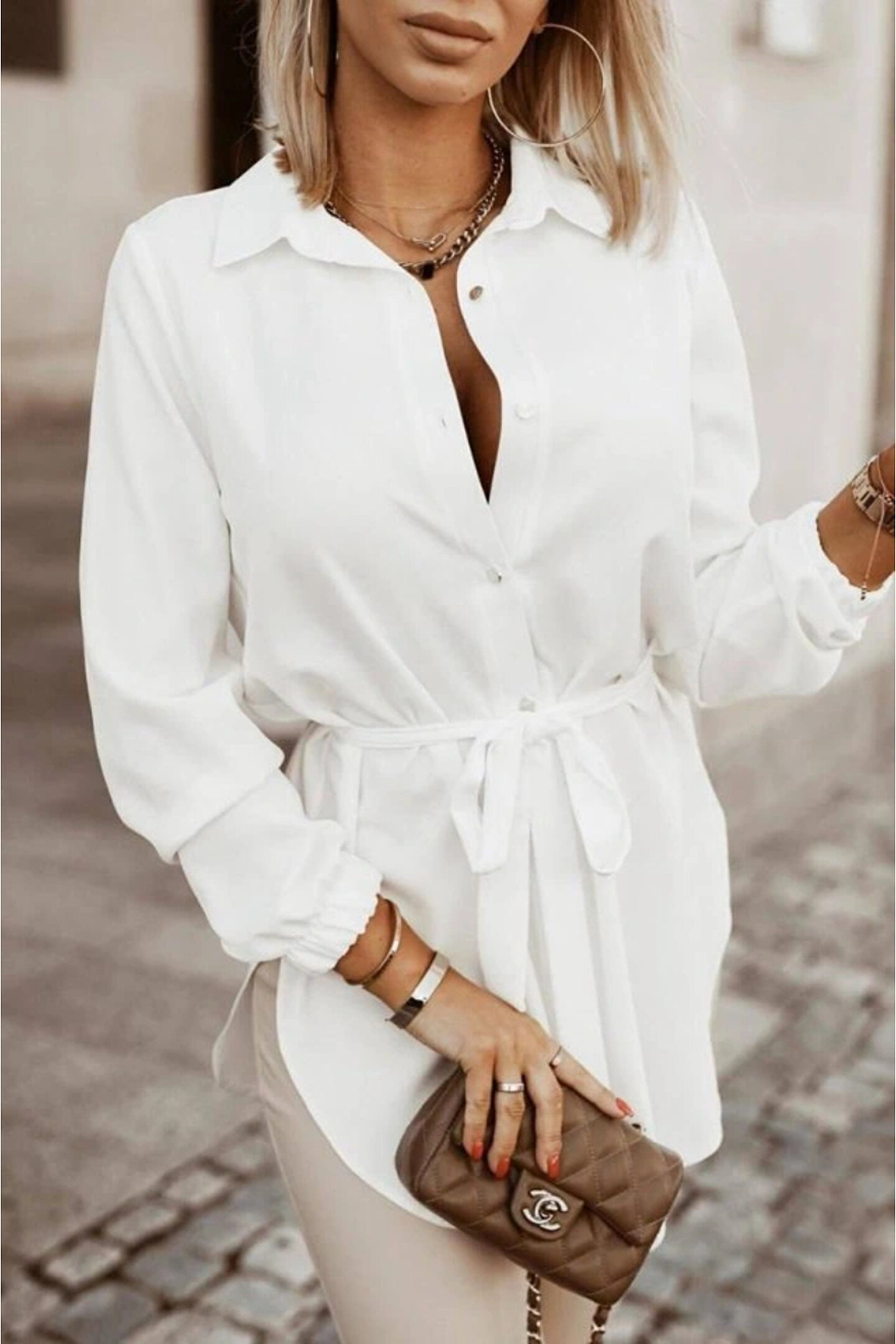 Kadın Metal Düğmeli Beli Kuşaklı Pamuk Polyester Kumaş Gömlek Elbise