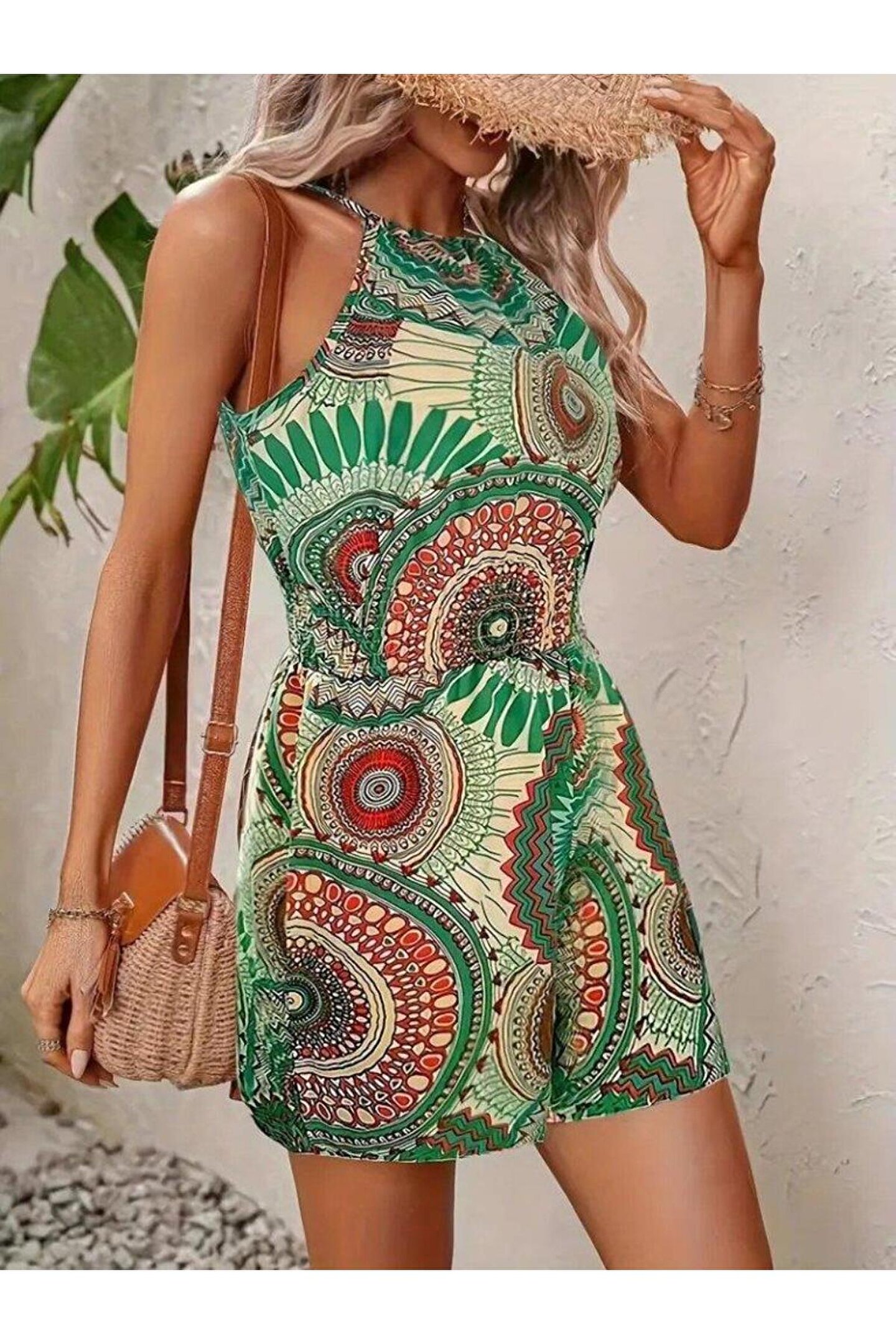 Silerra Kadın Omuzlardan Açık Boyun Arkasından Bağlamalı Beli Lastikli Desenli Süprem Kısa Tulum