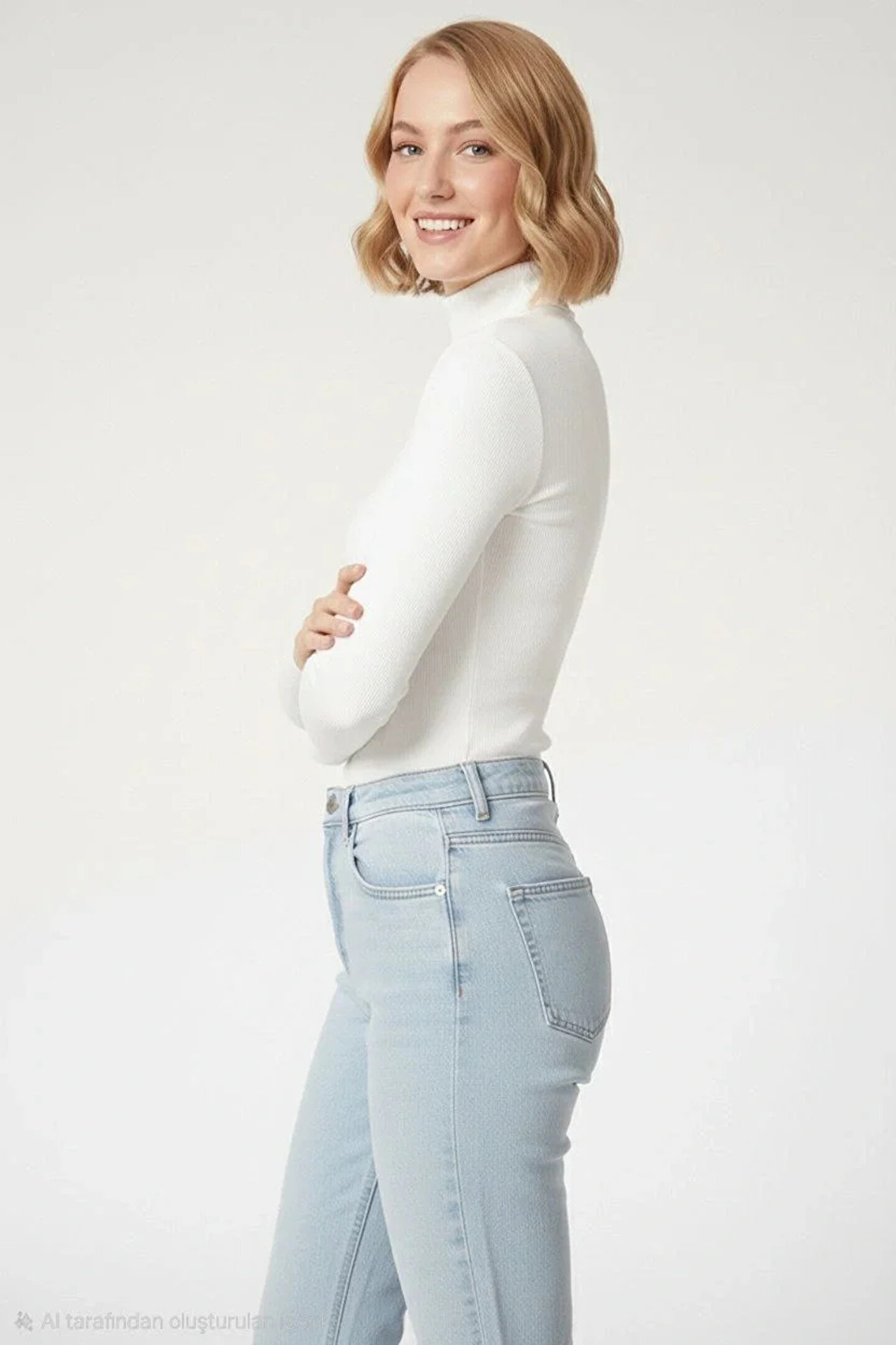 Kadın Tam Boğazlı Fitilli Likrali Kaşkorse Badi İnce Uzun Kollu Kazak - Beyaz